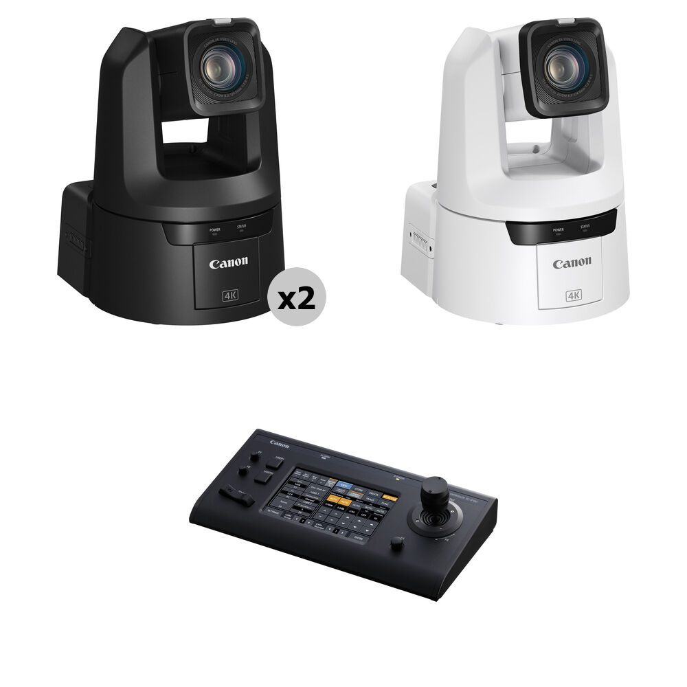 Coordinate your live streaming multi-camera setup with your decor using the Canon CR-N500 4K NDI 15x Zoom PTZ 3-Camera Kit from . This kit comprises the RC-IP100 Touchscreen PTZ Joystick Controller plus one white and two black CR-N500 4K NDI PTZ cameras. Features include NDI HX support, dual-pixel AF, built-in ND filters, 7" touchscreen, joystick, PoE+, and LAN/RS-422 control.