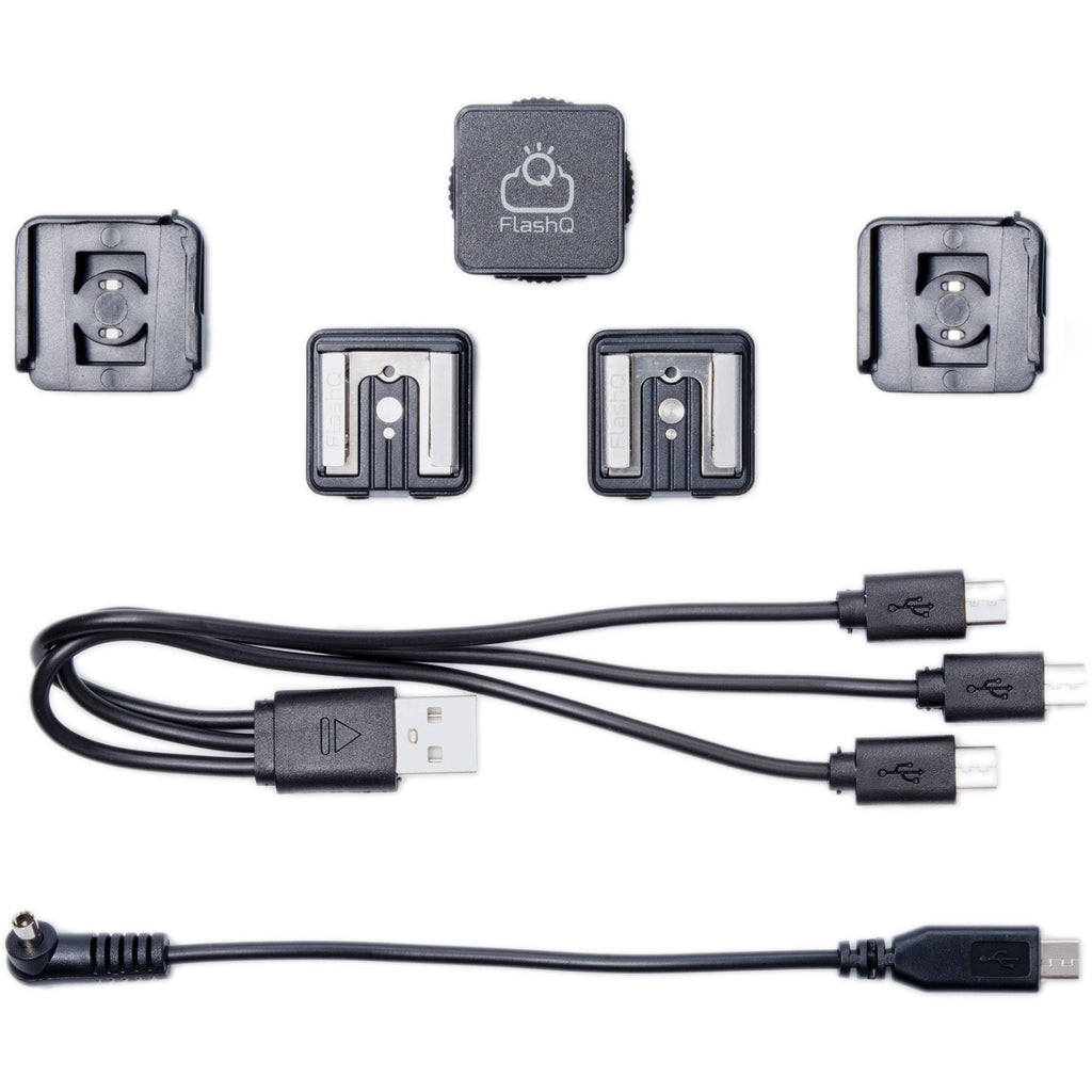 FlashQ Transmitter T2 2 x FlashQ T2 Receiver (Black) 2 x Cold Shoe Adapter 2 x Sync Cord with Male PC Plug USB Charging Cable Limited 1-Year Warranty