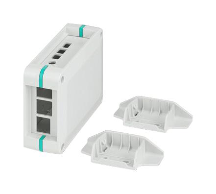- light grey (7035) polycarbonate housing with turquoise-blue corner inlays