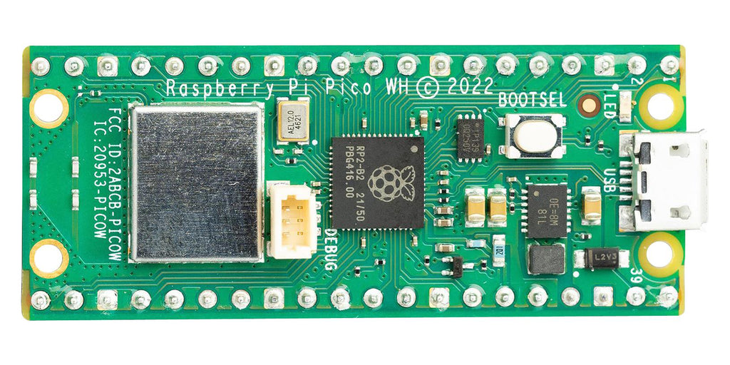 The Pico WH maintains the power and flexibility of the previous model, adding both wireless connectivity and pre-populated headers for greater integration into IoT applications. WiFi support is enabled via the integrated Infineon CYW43439 chip and contained in a metal shield can to reduce compliance costs. The Pico features flexible digital interfaces and can be easily programmed over USB using C/C++ or MicroPython, thanks to a comprehensive SDK with software examples and full documentation.