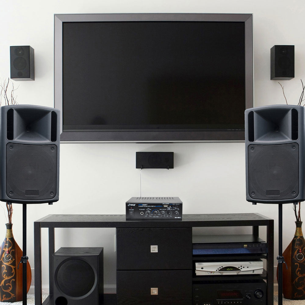 Enjoy stereo sound with the Pyle Pro Mini Blue-Series Stereo 80W Power Amplifier . Its 2-channel design outputs up to 40W per channel for true stereo sound. The integrated rotary volume control will allow you to fine-tune your audio playback, and it features an 1/8" aux input on the front and three stereo RCA inputs on the back. A microphone input and independent mic volume control allows you to sing along with your music, or use the amplifier as a public address system. Integrated Bluetooth connectivity enables wireless streaming from your favorite compatible devices such as smartphones and tablets. The front-panel USB port will charge your mobile device as an added convenience.