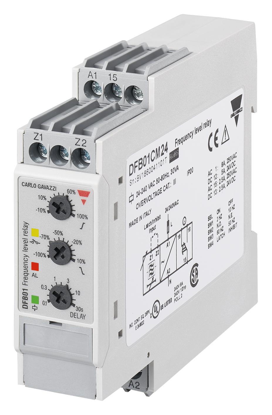 CARLO GAVAZZI DFB01CM24 Monitoring Relay, 240VAC Supply, 250V/8A Contact, SPDT, DIN Rail Mount, Screw Terminal