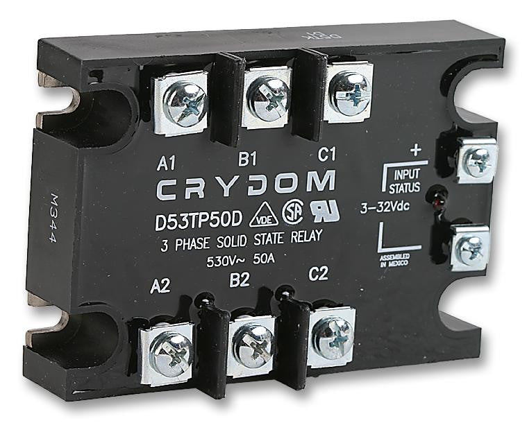 The D53TP50D is a 3-phase Solid-state Relay with panel mount, 53TP series. AC output, SCR output for heavy industrial loads. Zero-crossing (resistive loads) or random-fire (inductive loads) output.