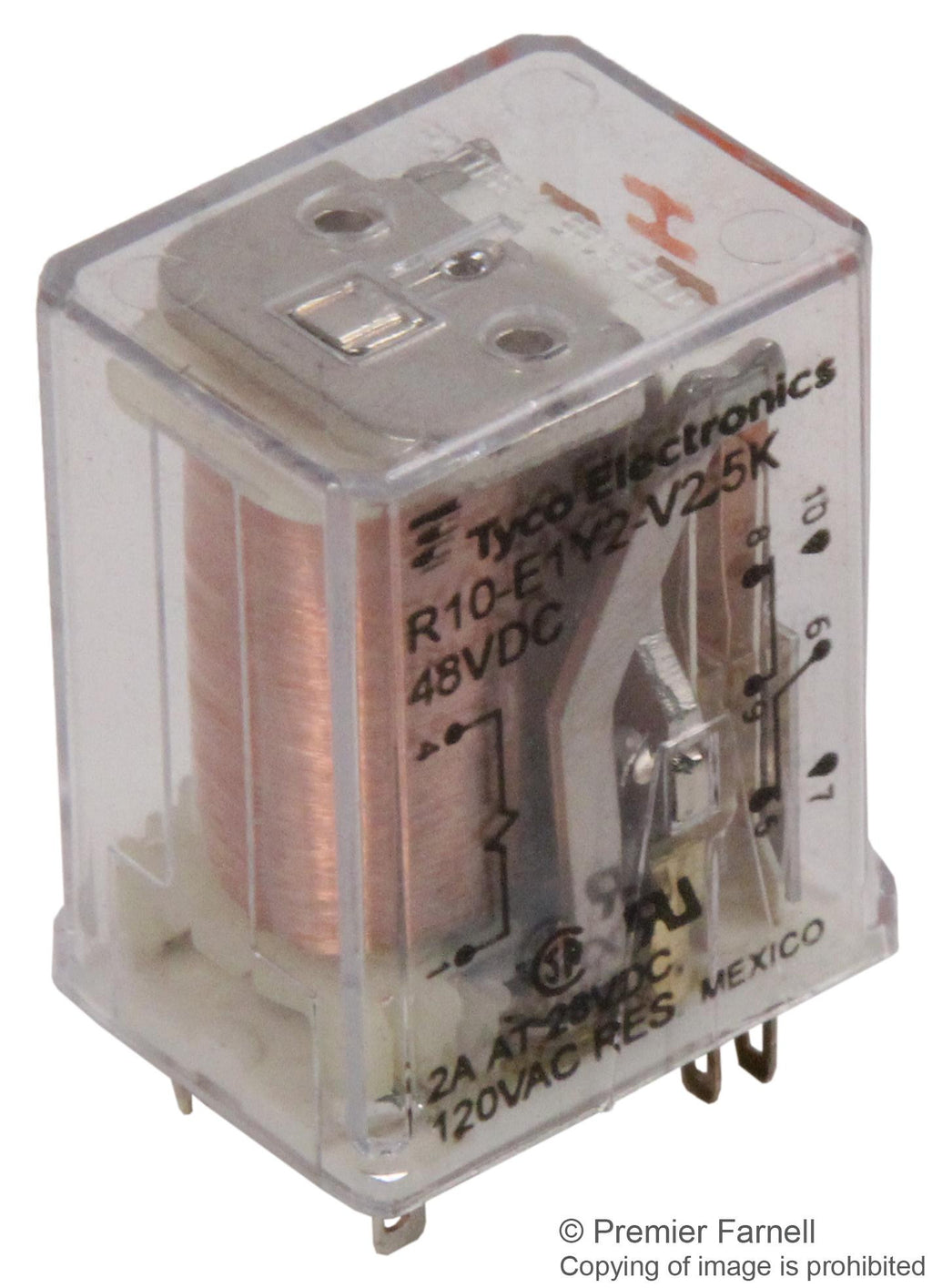 This is a RELAY, DPDT, 120VAC, 28VDC, 2A product from POTTER&BRUMFIELD - TE CONNECTIVITY with the model number R10S-E1Y2-J500