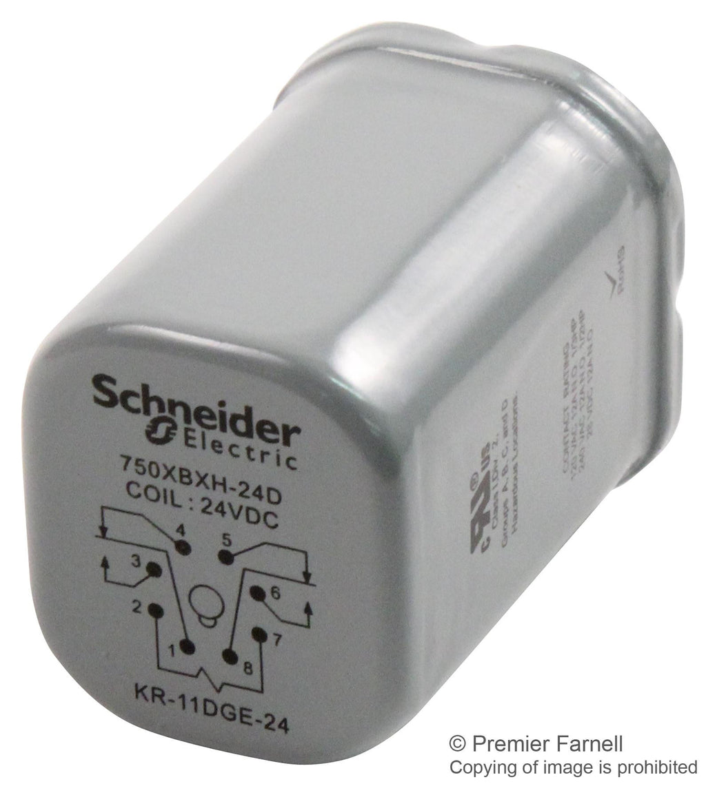 This is a RELAY, DPDT, 240VAC, 28VDC, 12A product from SCHNEIDER ELECTRIC/MAGNECRAFT with the model number 750XBXH-24D