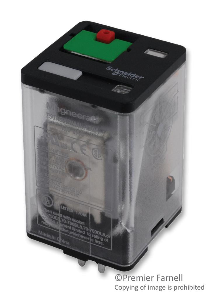 This is a RELAY, DPDT, 277VAC, 30VDC, 10A product from SCHNEIDER ELECTRIC/MAGNECRAFT with the model number 750XBXRM4L-120A