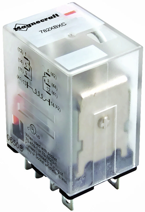 This is a RELAY, DPDT, 277VAC, 28VDC, 12A product from SCHNEIDER ELECTRIC/MAGNECRAFT with the model number 782XBXM4L-24D