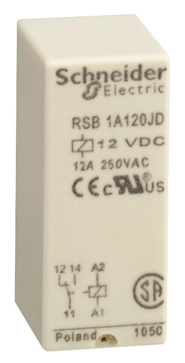 The RSB1A120BD is a general-purpose plug-in Power Relay with SPDT silver alloy contact. This Zelio RSB-series socket mount power relay features as compact size, 1 or 2 C/O contacts, used on industrial machines, machines and building equipment, simple hard-wired logic control system cycles, extra feature for industrial PLCs.