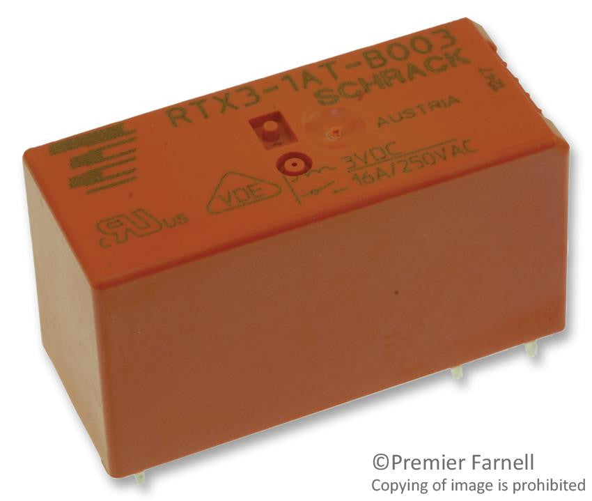 This is a RELAY, SPST-NO, 250VAC, 16A product from SCHRACK - TE CONNECTIVITY with the model number RTX3-1AT-B003