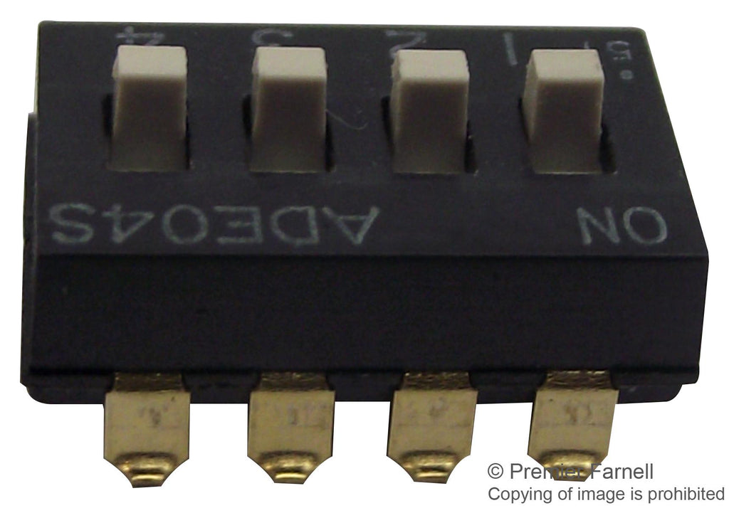The 1825058-7 is a 4-pole surface-mount DIP Switch with SPST contact configuration. It features flush actuator, high pressure contact system, process-able without tape seal and auto insert-able.