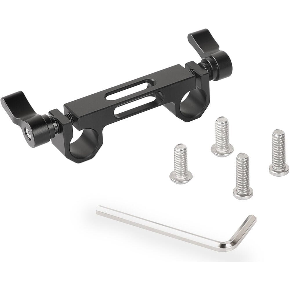 Mount an accessory such as a light, monitor, extension arm, shoulder pad, or battery plate onto separately available standard 15mm LWS rods with this 15mm LWS Rod Clamp with 1/4"-20 Slots from CAMVATE. The clamp features two 15mm rod ports with standard LWS spacing, which tighten using locking levers. Two 1/4"-20 screw-size slots on either side allow you to mount the clamp onto a rig or cage. Four 1/4"-20 screws and an Allen wrench are included for mounting.