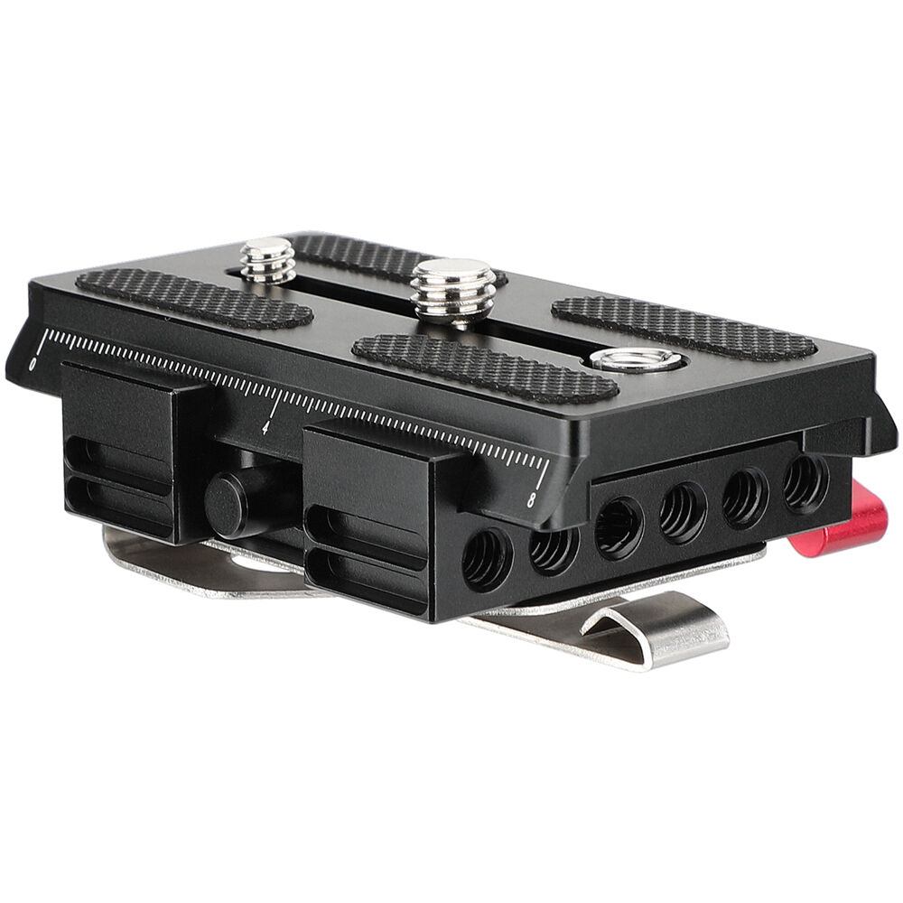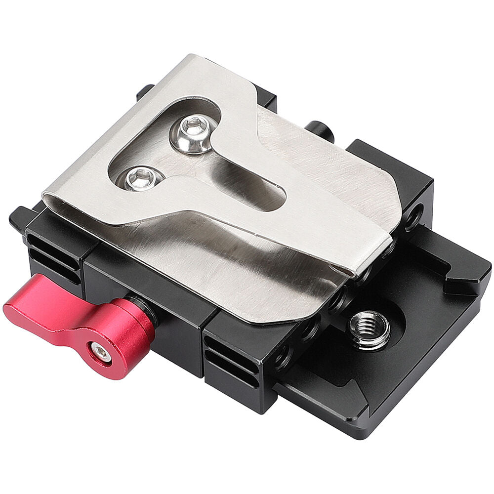 Mount a quick release baseplate on your waistband for hands-free mounting when your camera is not in use with this Manfrotto-Type Quick Release Plate, Clamp Baseplate, and Handy Belt Clip from CAMVATE. The top plate is a Manfrotto-compatible quick release plate with one each 1/4"-20 and 3/8"-16 screw to attach to the bottom of your camera. The bottom plate clamps onto the camera plate. Multiple 1/4"-20 and 3/8"-16 threads on the bottom allow you to attach the included belt clip and slide it onto your waist. The configuration's release frame is 1.46".
