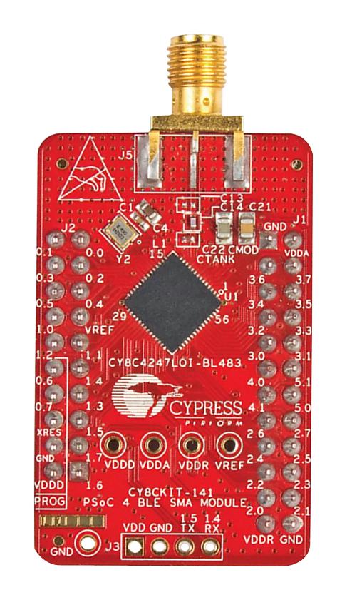 CY8CKIT-141 PSoC� 4 BLE SMA module is an easy-to-use solution for designing and testing complete Bluetooth Low Energy systems. The module features a PSoC� 4 BLE device, two crystals for the antenna matching network, an SMA connector for external antennas and RF testers, and other passives, while providing access to all GPIOs of the device. The module can be plugged into the CY8CKIT-042-BLE Bluetooth Low Energy Pioneer Kit or can be used standalone with an external programmer like the CY8CKIT-002 MiniProg3 (sold separately). PSoC 4 BLE is an ARM® Cortex®-M0 based single-chip solution that integrates programmable analogue front ends and digital peripherals, the CapSense® technology for touch sensing, and a Bluetooth® Low Energy or Bluetooth Smart radio.
