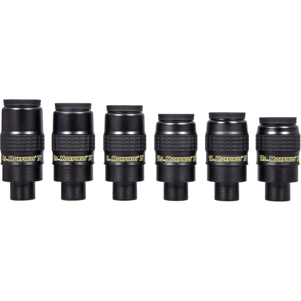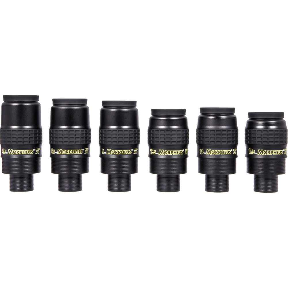 Get all six oculars in the series with the Alpine Astronomical Baader 76° Morpheus 6-Piece Eyepiece Set and enjoy the wide variety of magnifications offered by them. From a high-power 4.5mm to a relatively low 17.5mm, you can customize the magnification to the object you're looking at. To safely store and transport the eyepieces, a hard carrying case and accessory holster are included.