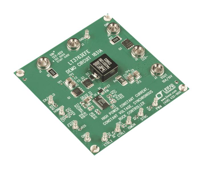 Demonstration circuit 1831A is a high power constant current, constant voltage synchronous buck controller featuring the LT®3763. The input of the demo board is up to 60V. The output is optimized for 10V, 10A as a LED driver. As an LED driver, the output current is being regulated until the output voltage reaches a programmed voltage limit. The voltage limit on the demo board is set to around 15V by R11 and R14. The load to be used with this demo board is high current LEDs or laser diodes. Smaller LEDs may not be able to handle the high current, even for a short period of time. It is necessary to mount the LED load on a proper heat sink. A fan may become necessary to avoid exceeding LED�s maximum temperature rating.