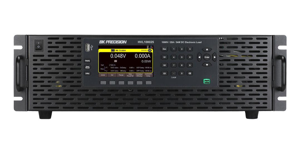 HVL100025 is a HVL series programmable DC electronic load. Suitable for ATE system applications, this series supports a variety of dynamic loading conditions for evaluating DC-DC converters, batteries, battery chargers, photovoltaic arrays and other high power DC sources. In addition to CC/CV/CR/CW operating modes, the HVL Series features continuous, pulse and toggle transient operations to precisely switch between two load levels. Advanced list mode programming makes it easy to set up and execute complex load sequences from the front panel. For applications requiring more power, up to 10 identical HVL Series models can be combined in parallel to increase total sink capabilities to 60kW. Operating software provides remote instrument control and monitoring from a PC. Separate battery test software simplifies battery discharge testing with data logging. Built-in remote PC interfaces include USB LAN, RS232 and GPIB supporting SCPI commands.