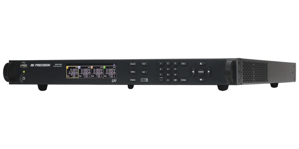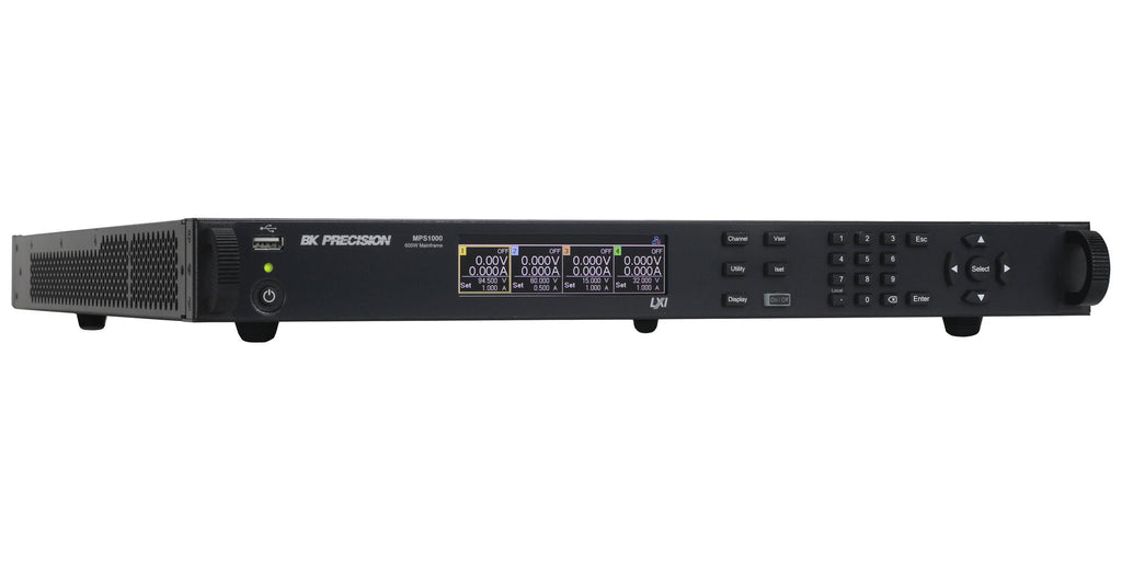 MPS1000 is a 600W MPS series mainframe. This mainframe houses and controls up to four DC power modules. Modules are interchangeable and the mainframe guideposts combined with engineered mating pins ensure a secure fit into mainframe slots. Featuring an included rack-mount kit, the compact 1U form factor is ideal for ATE system applications.