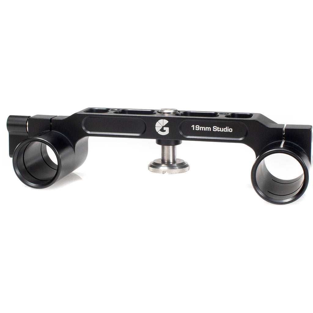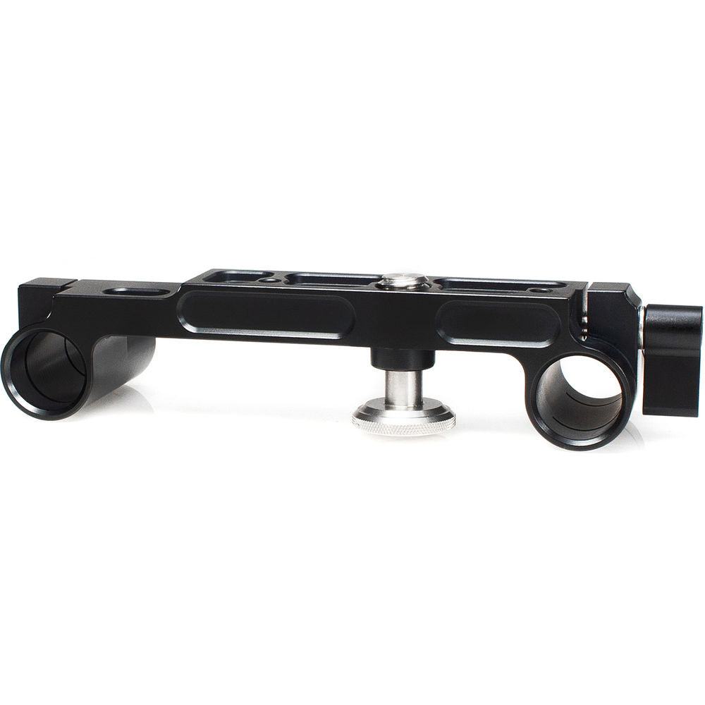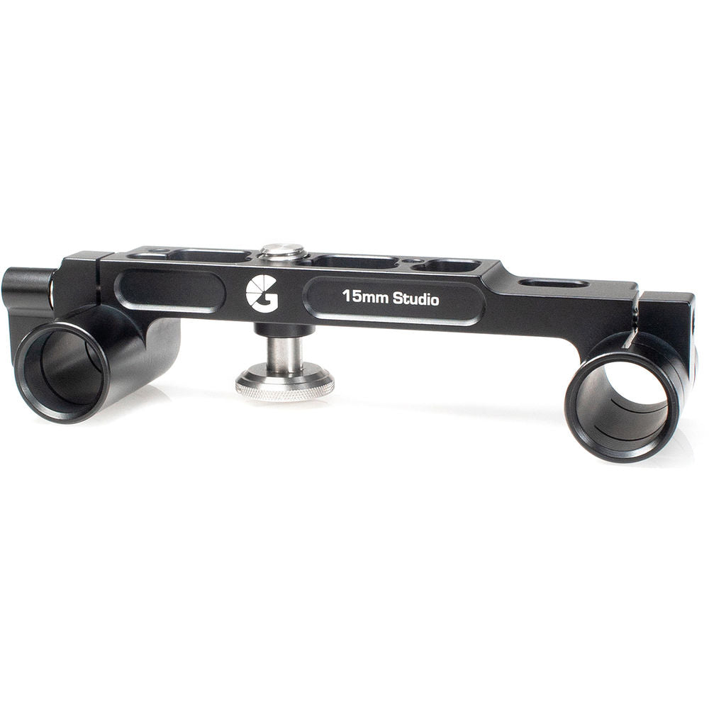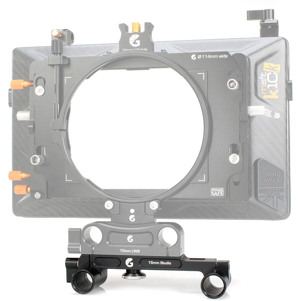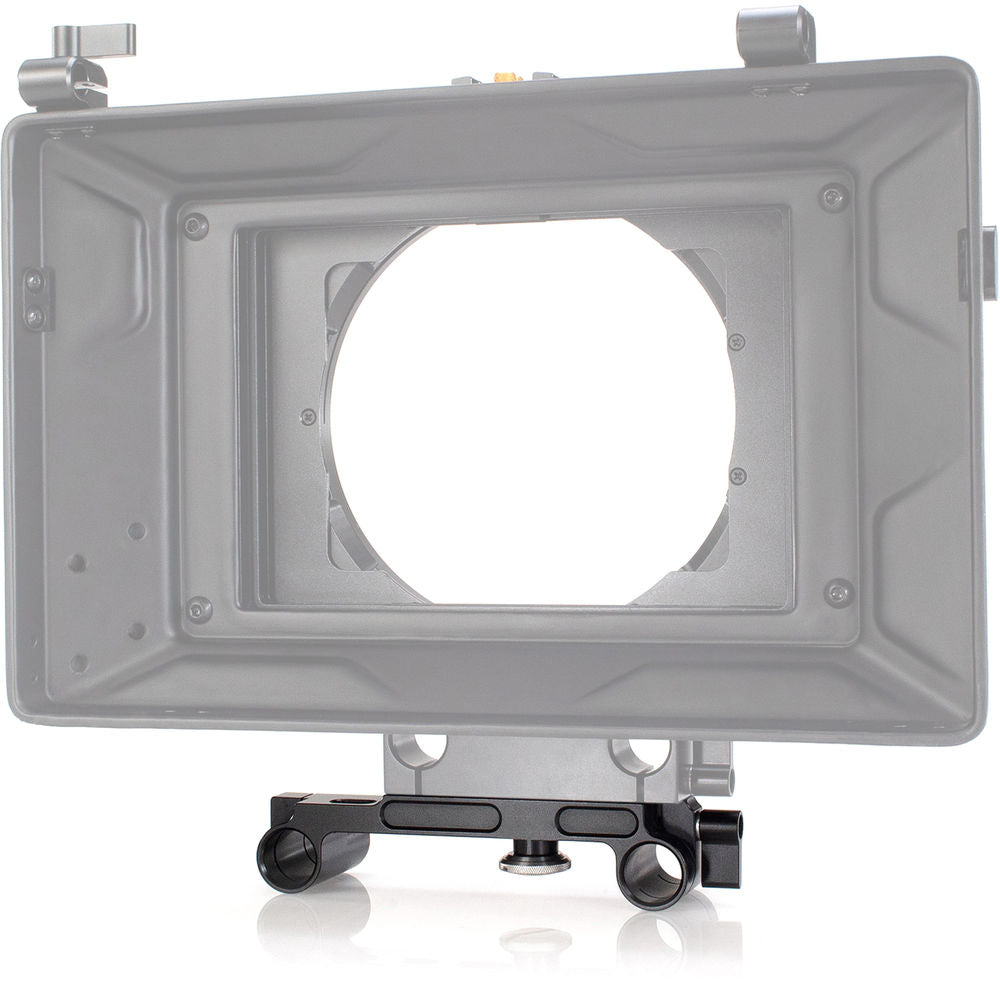 The studio bracket connects using a 3/8"-16 anti-twist thread to provide 15mm rod support for the matte box. A single locking lever secures both rod ports. See below for compatibility.
