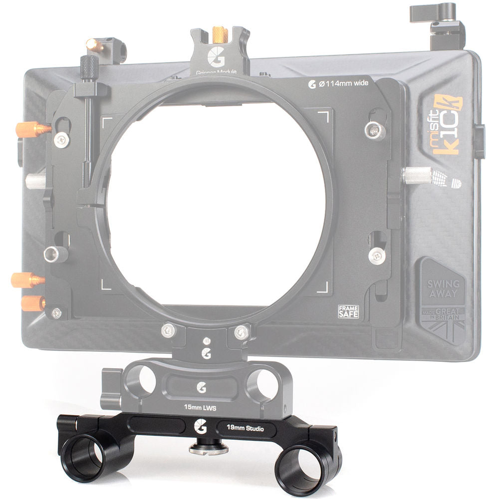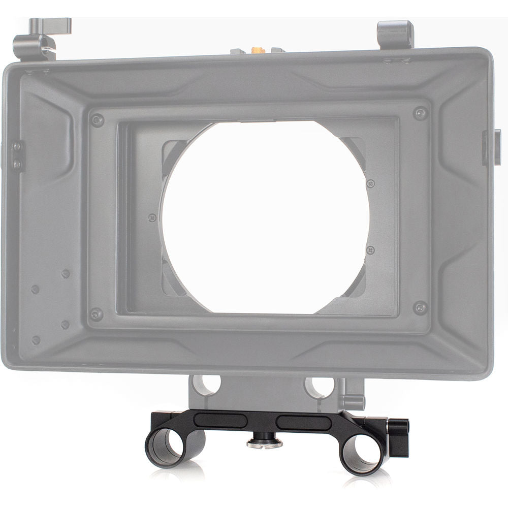 The studio bracket connects using a 3/8"-16 anti-twist thread to provide 19mm rod support for the matte box. A single locking lever secures both rod ports. See below for compatibility.