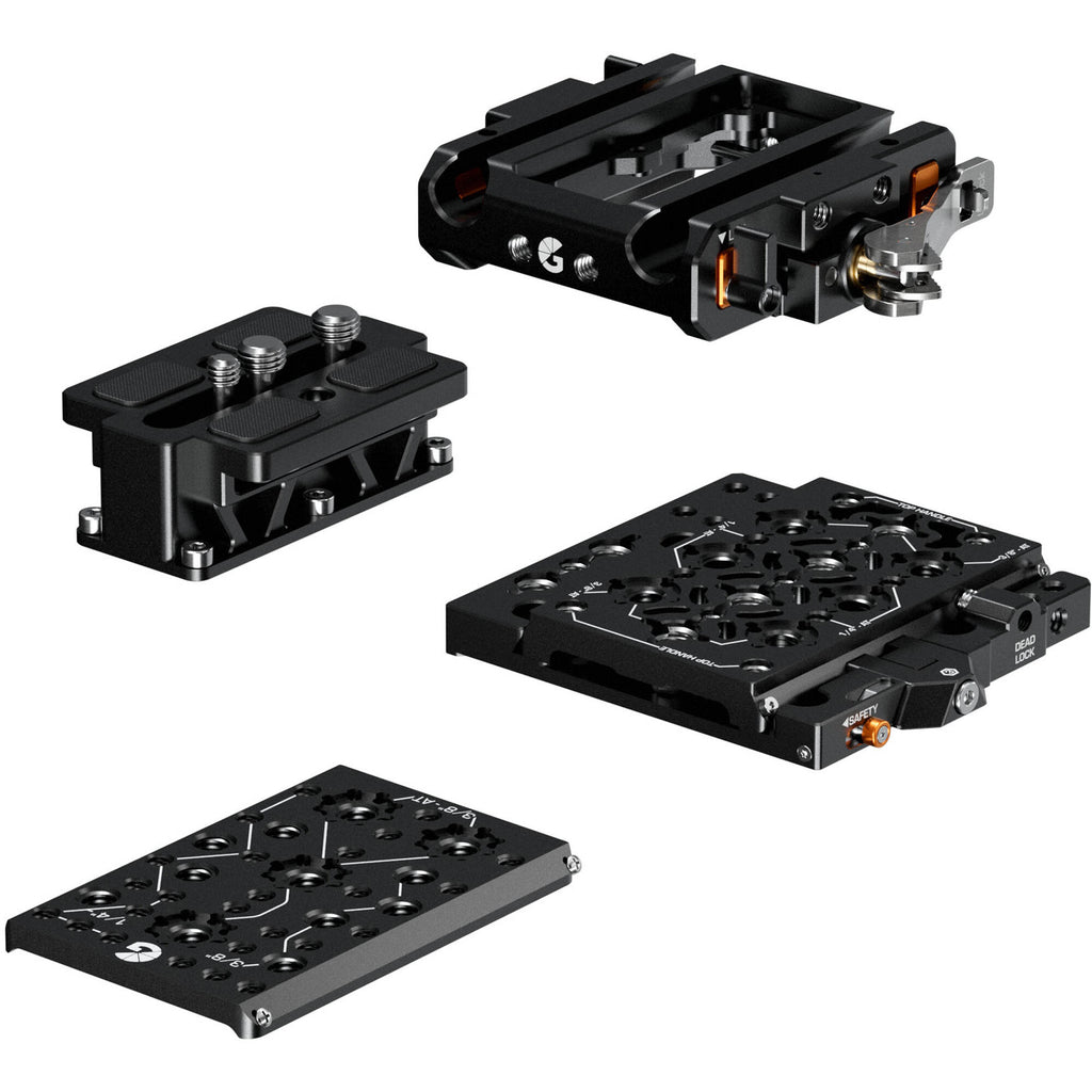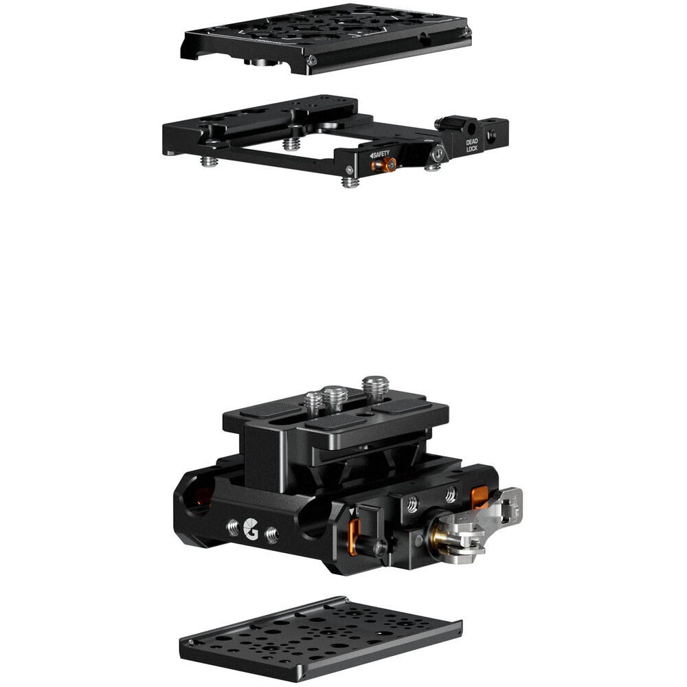 The plate features rubber pads to protect the camera and prevent twisting, and it includes six captive screws to mount it onto the separately available baseplate. Its center slot design allows you to mount the camera using the included mounting screw and slide it up and back for balance.