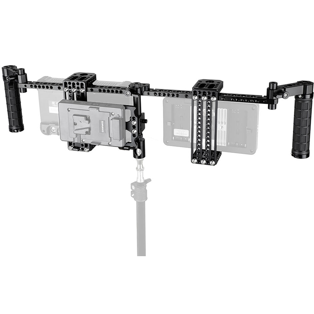 Use the cage's top and bottom cheese plates with multiple 1/4"-20 and 3/8"-16 threads to mount wireless receivers or other accessories. This aluminum alloy cage features dual rubber grips, a battery plate, and a light stand adapter for securing the cage instead of hand-holding it. Adjust the height and position of the two monitor plates using the included Allen wrench.