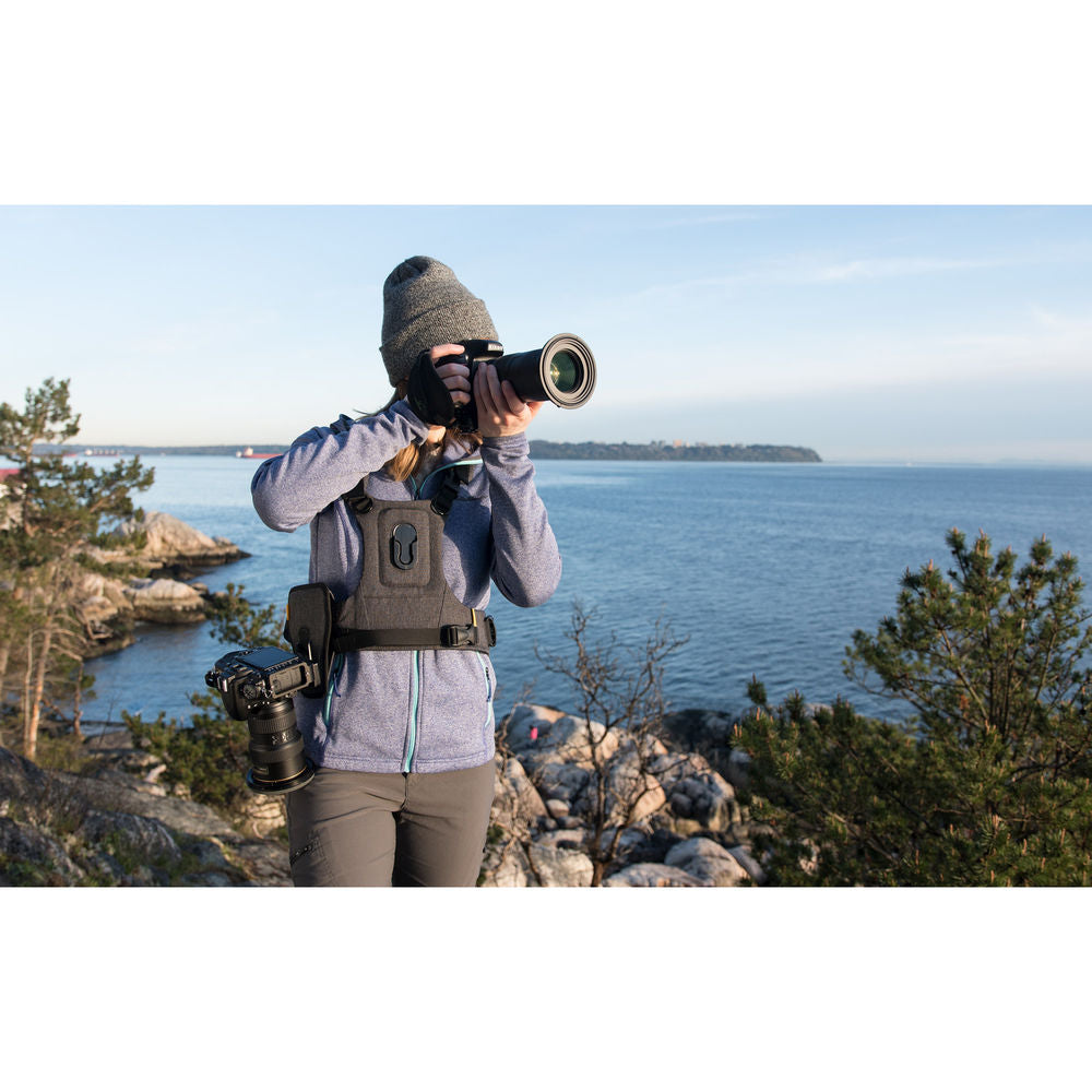 Designed for active photographers, the gray CCS G3 Harness-2 from Cotton Carrier helps to evenly distribute the weight of two cameras with attached lenses. This arrangement keeps the cameras at the ready for making the most of spontaneous photographic opportunities, while also keeping hands free, equipment safer from grab-and-go theft, and reducing unwanted camera movement. Photographers will appreciate the one-size-fits-all approach, comprised of adjustable shoulder straps and a quick release waist belt.