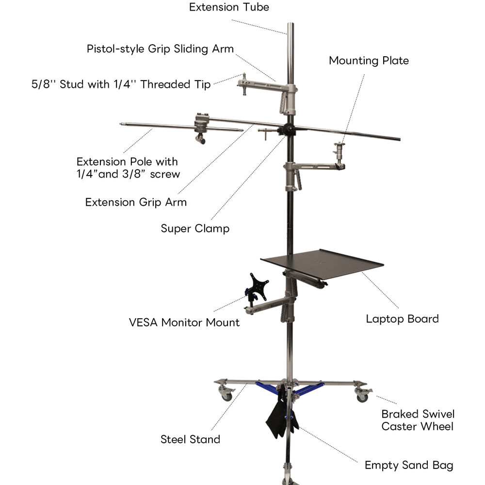 The CINETREE Gear Tree with Rolling Tripod Stand from DigitalFoto Solution Limited outfits content creators with a mobile studio and workstation that can house all of their devices to maximize their floorspace. The gear tree revolves around a tripod stand with caster wheels, which has a total working height range of 3.9 to 7.3' using the included extensions. It can support loads up to 55 lb and features specific mounting components for your laptop and monitor. Use the 5/8" baby pin receivers, male connectors, and 1/4"-20 screws to secure additional lighting, power, and audio accessories.