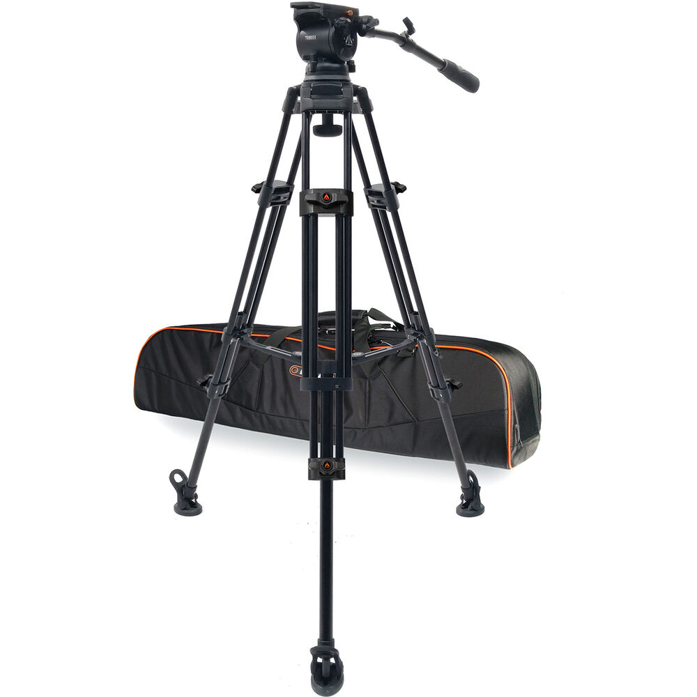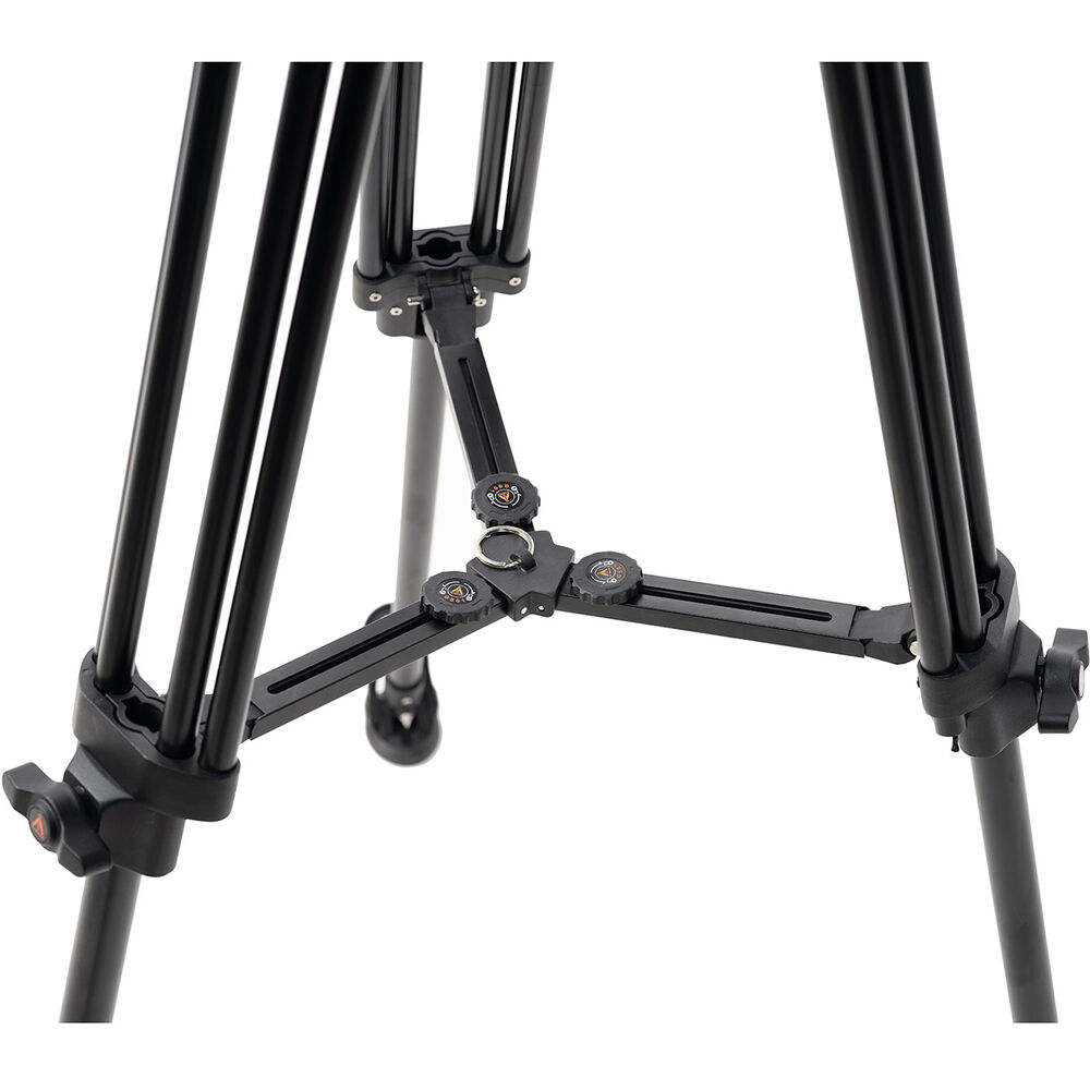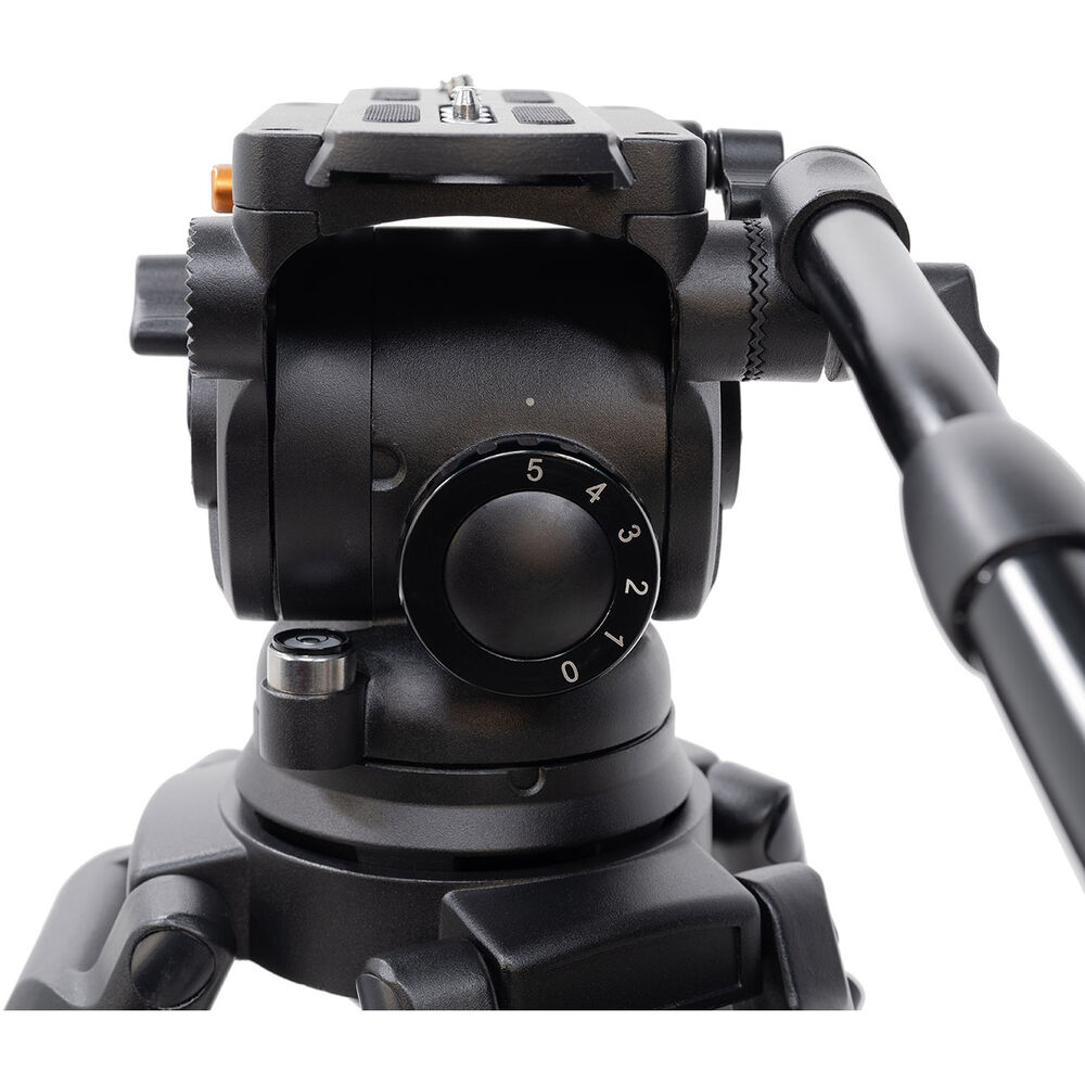The aluminum legs feature a twist-lock design for quick adjustment, a mid-level spreader, and a 100mm bowl size, and they fold down to 28.1" for transport. They also incorporate spiked feet for increased grip on soft surfaces and spike covers that allow you to use the legs on hard/slippery surfaces. The fluid head mounts into the 100mm bowl and supports loads up to 26.4 lb. It features a sliding camera plate, 0+5 steps of counterbalance, and a fixed drag system for smooth movements.