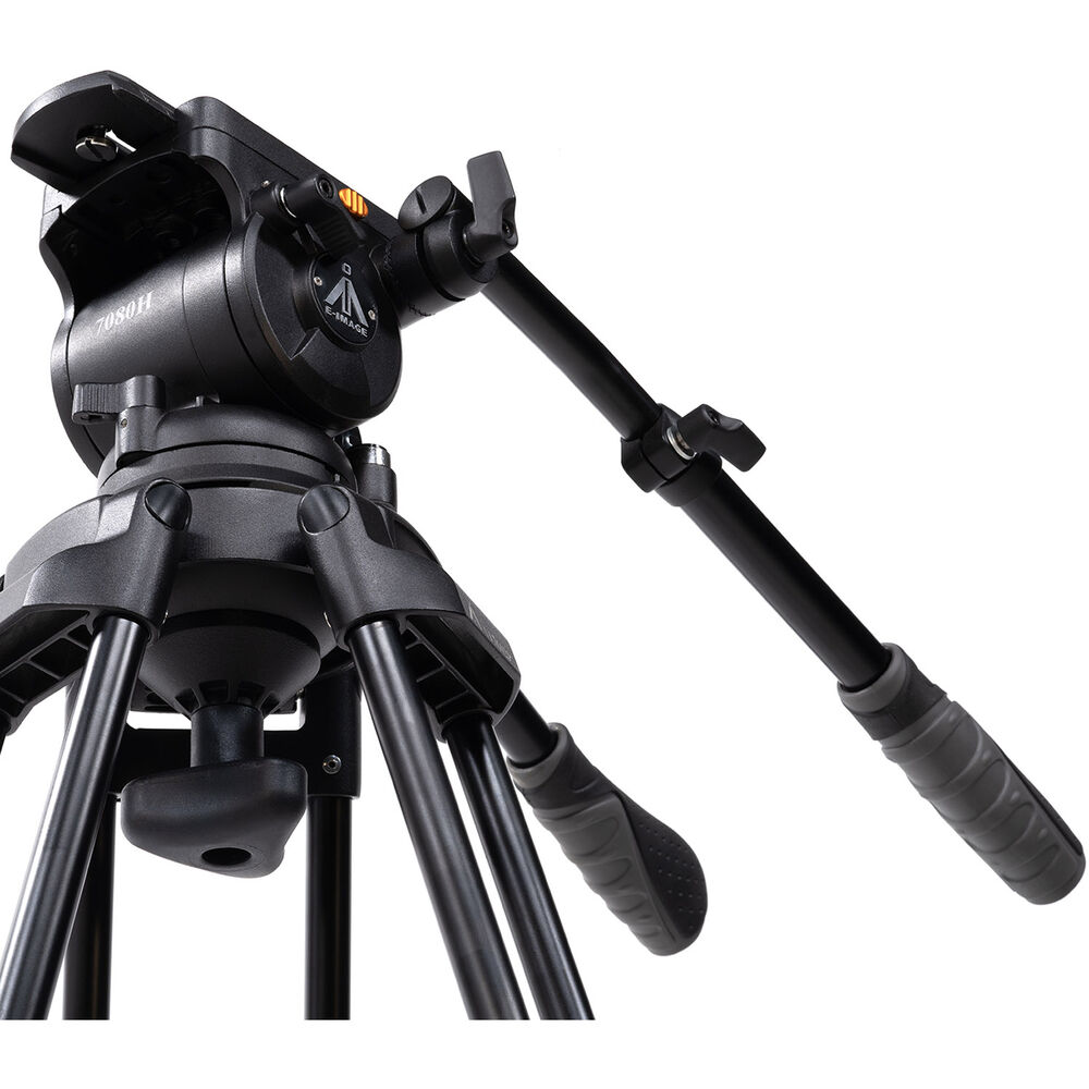 This EI-7080-AA 2-Stage Aluminum Tripod Field Kit from E-Image includes the AT7602A heavy-duty aluminum tripod legs, the EI-7080H fluid video head, a GP2 tripod plate, one GB3 pan handle, a mid-level spreader, removable rubber feet, and a carry bag to store and transport the entire system.