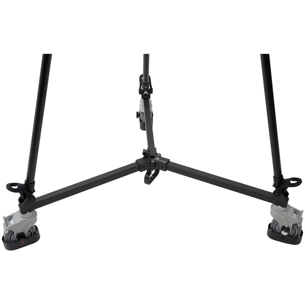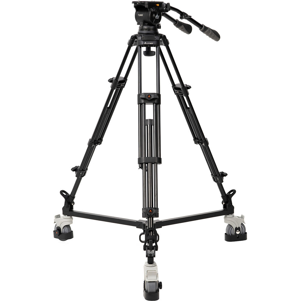 The aluminum legs feature a twist-lock design for quick adjustment and a 100mm bowl size, and they fold down to 28.1" for transport. The fluid head mounts into the 100mm bowl and supports loads up to 33 lb. It features a sliding camera plate, 0+5 steps of counterbalance, and a fixed drag system for smooth movements. The whole system mounts onto the included studio dolly to smoothly transport your camera around the set.