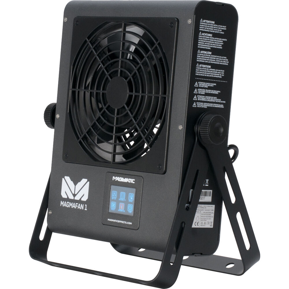 The MagmaFan Compact Variable Speed Stage Fan from Elation Professional features multiple control options, linear output control, low power consumption, adjustable blowing directions, and durable metal housing. Low power consumption is only 80W, allowing you to put on the same circuit as your fog machine. The adjustable mounting/floor bracket enables you to adjust the fan output 90 degrees. It features an easy-to-use onboard LCD touchscreen control panel, intuitive DMX-512, and RDM control. Its durable aluminum housing design allows for easy carry and storage, with optional wired and wireless remote control.