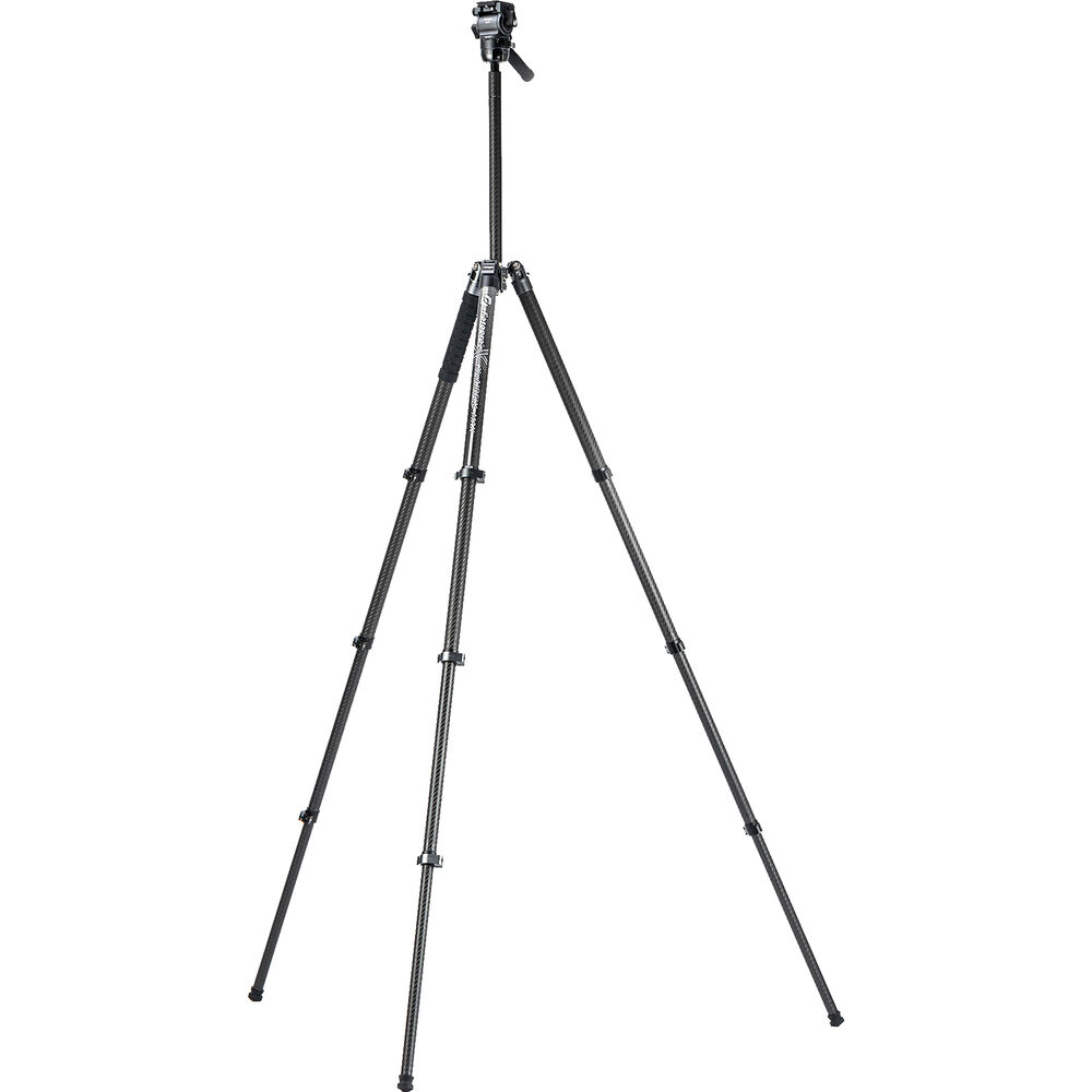 The gray X-AIRFLY Max Video Tripod from Fotopro is a compact and lightweight carbon fiber travel tripod designed for travel and location photography and videography. It has a maximum height of 67.3", can support cameras weighing up to 13.2 lb, and weighs only 3.67 lb. It folds down to a compact 21.5" and is easy to tuck into a backpack or carry-on luggage. The fluid head can be used with heavier video rigs and can also be converted to a locking ball head for more stability and fine adjustments for photography.