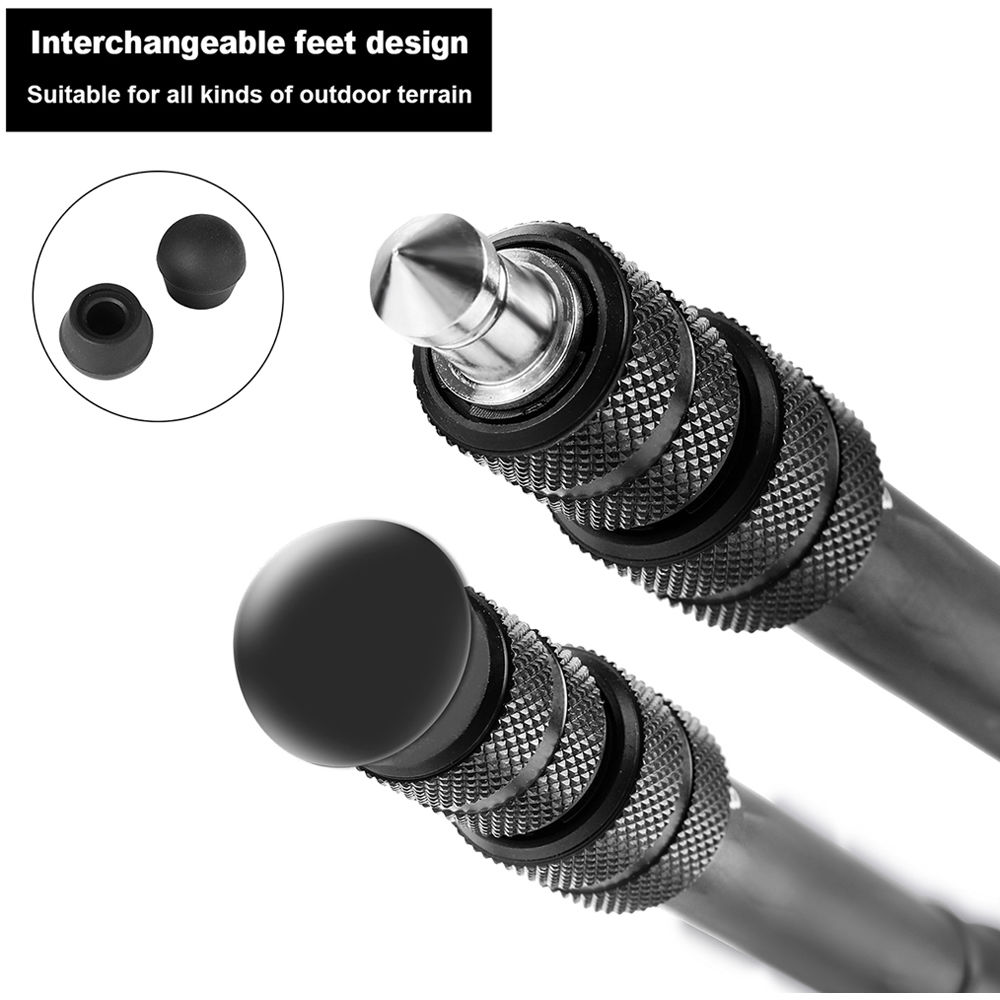 Portable Multi-Function TripodLoad Capacity: 6.6 lbUniversal Mobile Phone ClipThree-Section Carbon Fiber Legs The Tabletop Mini Tripod Carbon Fiber JJ-G265 from GVM is a portable multi-function tripod with a folded length of 10.4" and a 6.6 lb load capacity. Perfect for travel, this tripod features a dual-action ball head with an independent pan lock that enables you to rotate the head 360°, and a ball lock lets you vertically position your camera at a 90° angle. The tripod includes a cell-phone clip for accepting phones up to 3.3" wide, and a WD1 Magic Hand is also included, which provides a multi-function arm with 1/4"-20 interfaces at both ends. Three-section carbon fiber legs with twist locks extend the tripod to a height of 15.5", and the included telescoping pole increases the maximum working height of the tripod to 28.3". Removable rubber feet are provided for working on smooth surfaces, and these removable feet enable you to use the included spiked feet when shooting outdoors and on uneven terrain.