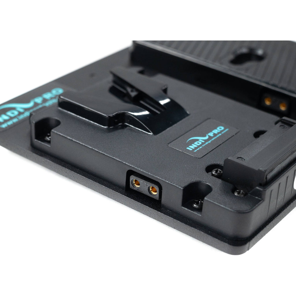 Use the Hot-Swap Gold Mount/V-Mount Adapter Plates to V-Mount Plate from IndiPRO Tools to power your camera, light, monitor, or accessory that has a V-mount plate using one V-mount battery and one Gold mount battery. The double battery plate is hot-swappable, so you don't have to power down your gear when changing batteries for charging.