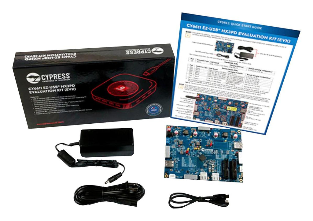 CY6611 EZ-USB� HX3PD EVK board, 19V, 65.2W AC/DC power adapter, Full-featured USB Type-C cable, Quick start guide.