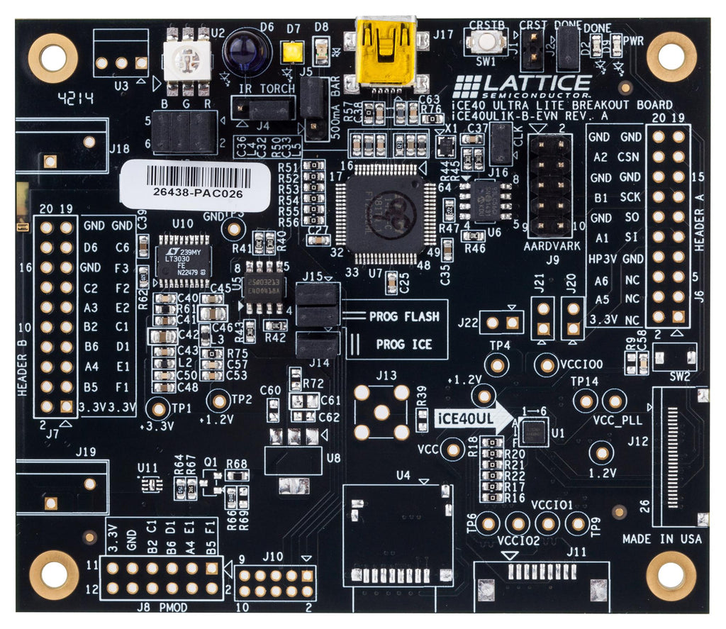 ICE40UL1K-B-EVN is a iCE40 UltraLite breakout board. This easy-to-use, low-cost breakout board is designed for evaluation and development using the high-density iCE40UL1K silicon in a compact 36-ball BGA package with maximum I/O. Ideal for rapid prototyping, it exposes each I/O via headers, allowing flexible development of custom functions. The board includes an RGB LED, a high-current torch LED, and an infrared LED to support quick evaluation of LED-based applications. It features simple connectivity, powered and programmed via a standard USB mini cable, and comes preloaded with RGB LED demo code and a user-friendly software GUI. For further customization, users can reprogram the onboard SPI Flash using Lattice�s free Diamond Programmer software, while the iCEcube2 design software. Combining affordability, flexibility, and convenience, this board offers a powerful platform for developers seeking to evaluate, prototype, and customize a wide range of low-power applications.