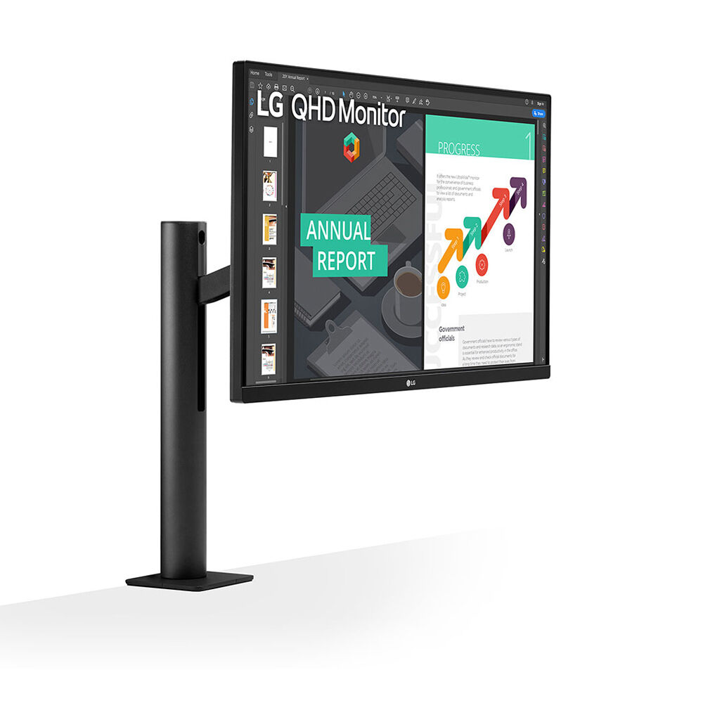 Lifelike Color with IPS and QHD Resolution At 27" and 2560x1440 resolution, this LG QHD IPS display features realistic and accurate color at wide angles. Monitor and Stand Combined Customize your setup in seconds. Raise, lower, tilt, and pivot thanks to the Ergo Stand's flexible design. Adapt the monitor to your environment and working style with a simple press-and-click mechanism. Compatible with Every Posture The Ergo is a welcome innovation for anyone who spends a significant amount of time at their desk. LG's technologically and ergonomically advanced stand helps to promote good posture through its high degree of adjustability, enabling each user to create a customized workstation. Cut the Clutter The compact design takes up very little desk surface and also contributes to easier installation. Helping users achieve a clutter-free environment, the 27QN880's one-cable USB Type-C solution conveniently provides fast data transfer and power for laptop charging. UPC: 195174002933| Size | 27" |