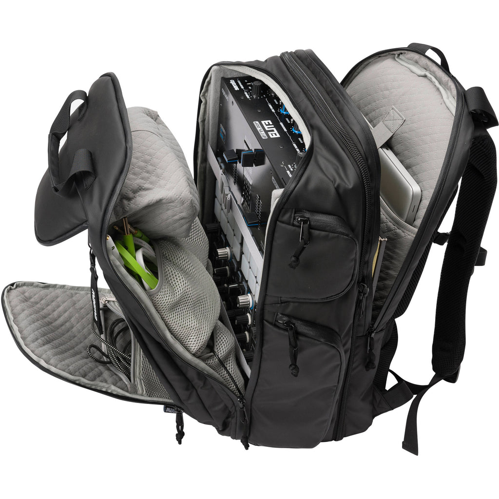 The bag is constructed from water-repellent RPET 900D shell and YKK AquaGuard zippers to protect your laptop, tablet, timecode records, and other expensive gear from the elements. A 100% waterproof tarpaulin features PVC-coated zippers. The padded back panel provides even air flow, while the ergonomic backpack straps and adjustable sternum strap help keep you comfortable while on the go. A detachable trolley sling is also included.