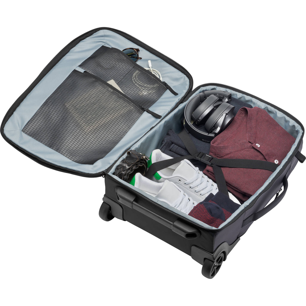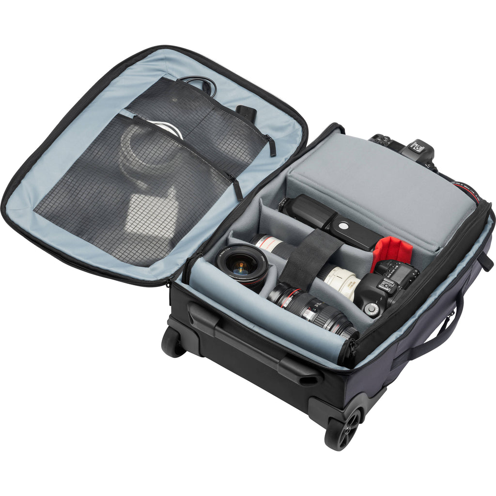 Ideal for the traveling photographer or urban commuter, the Manhattan Runner-50 Roller in gray from Manfrotto will keep up with the demands of everyday use. The soft nylon suitcase has a ridged interior structure, is water repellent, and includes a rain cover for days when the weather becomes more inclement. The bag is easily rolled on its trolley wheels and pulled by its retractable handle. The bag can be carried by its top and side handles and includes a bottom handle in case you need to pull it from an overhead storage compartment. The interior has Flexi Dividers that are fully customizable to accommodate a DSLR with a 70-200 zoom lens attached, a second DSLR with three to four lenses, and several changes of clothing. A pocket located on the front of the bag is dedicated to a tablet or a 15" laptop. Your primary camera is fully accessible through the zippered top of the bag, and a tripod can be attached to the front of the bag via its hidden straps and dedicated zip pocket. The Manhattan Runner-50 has a removable camera insert that converts into a backpack with comfortable shoulder straps. This allows it to be used as a normal case for when you are traveling for longer periods of time. The bag complies with most carry-on size regulations, but please check with your airline for restrictions.