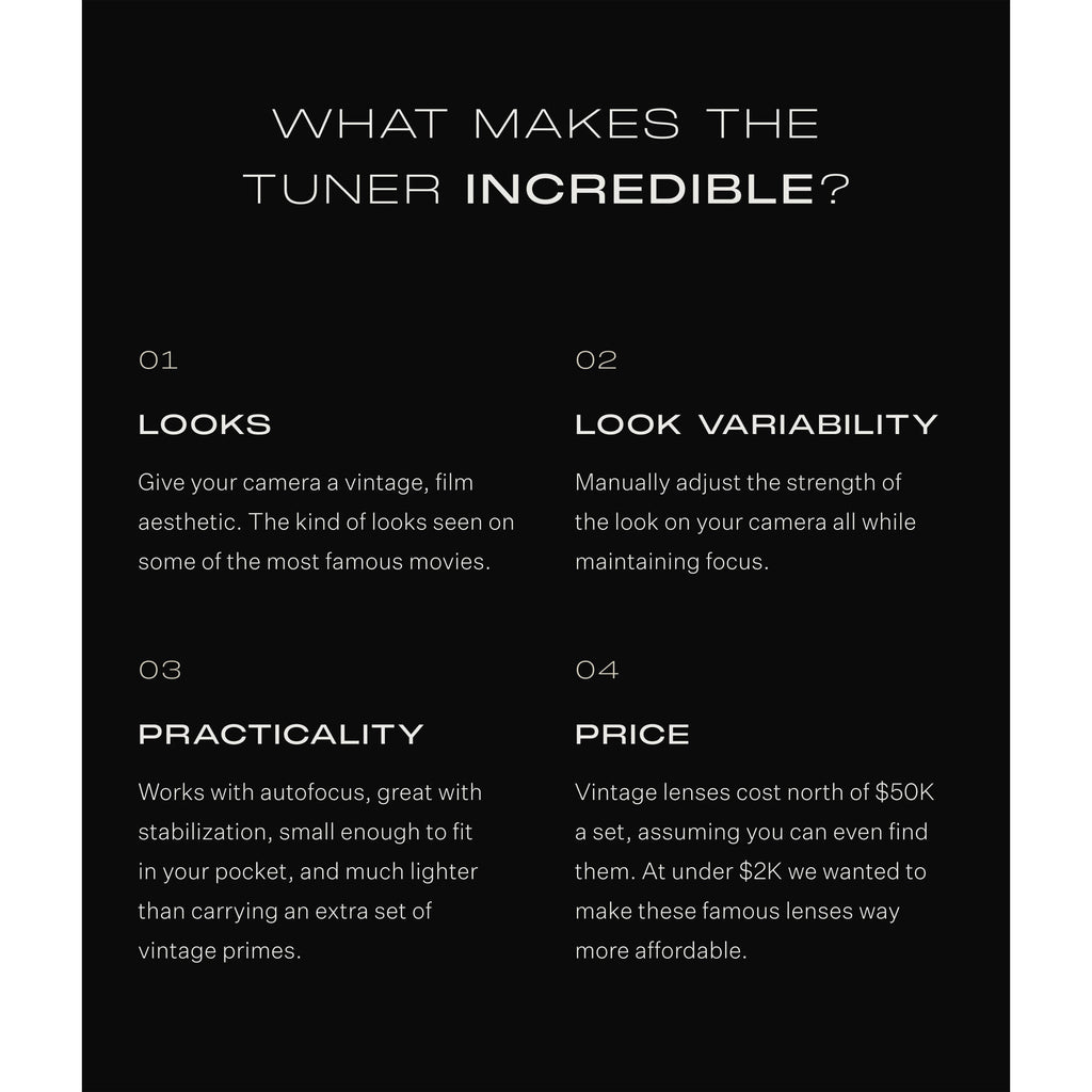 The Tuner provides standard EF-mount lenses and mirrorless digital cameras to emulate the look of vintage glass, so you don't have to track down a classic cinema lens. It makes your lens capture the look of a classic lens and provides manual control over the strength of the look without refocusing, reshimming, or changing the lens.