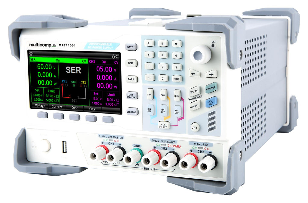 This series DC power supply with four independent outputs (Three regulated outputs and One USB output) is a cost-effective programmable DC power supply with excellent performance, reliable output, and a clear interface. The instrument has constant voltage (CV) and constant current (CC) modes, and short-circuit and over-voltage protection functions, which can perfectly meet various test requirements.