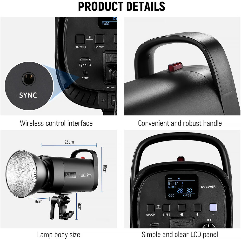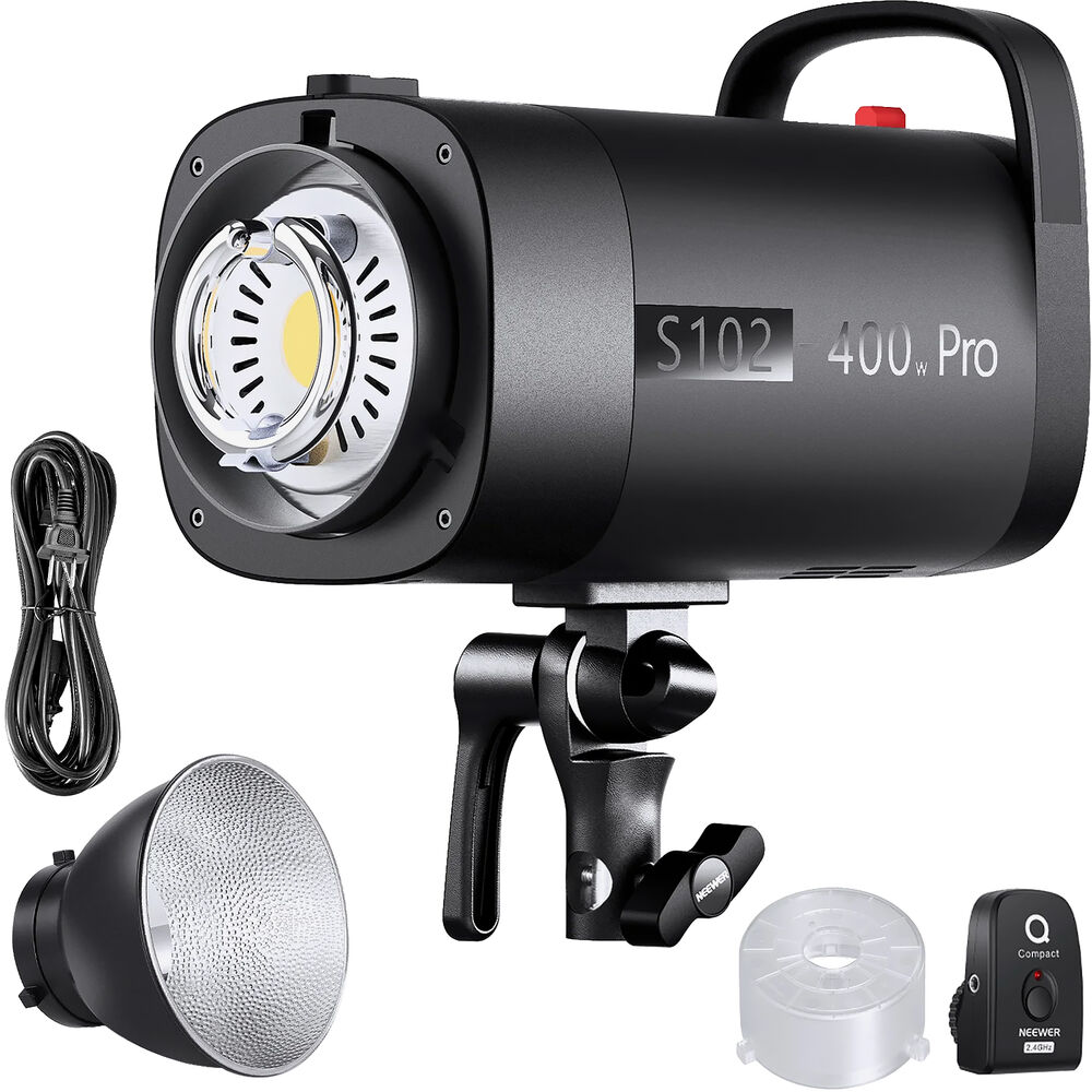 Neewer expands their line of strobes with the S102-400W PRO Studio Monolight. Just as the S101-400W PRO model, the S102-400W PRO works great for portraits, products, and other types of flash photography. This S102 version also has an output that can be adjusted manually from full power to 1/64, with new recycling times of 0.1-1.5 sec and flash duration from 1/100 to 1/1000 sec. The head's upgraded 30W LED modeling light is one of the main highlights of this model. The convenient LED lamp has a color temperature of 5600K to open up the possibility of video production. Neewer includes a wireless trigger, a standard reflector, and a power cord to facilitate your setup.