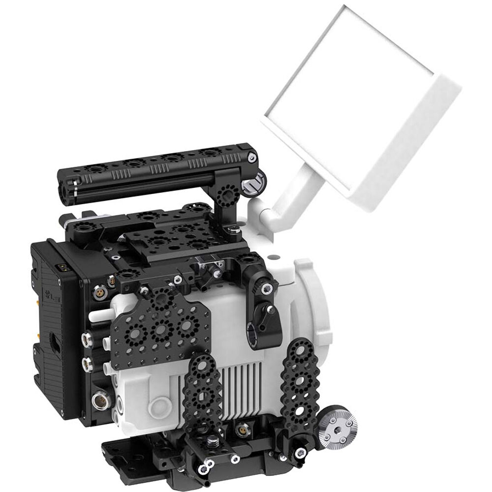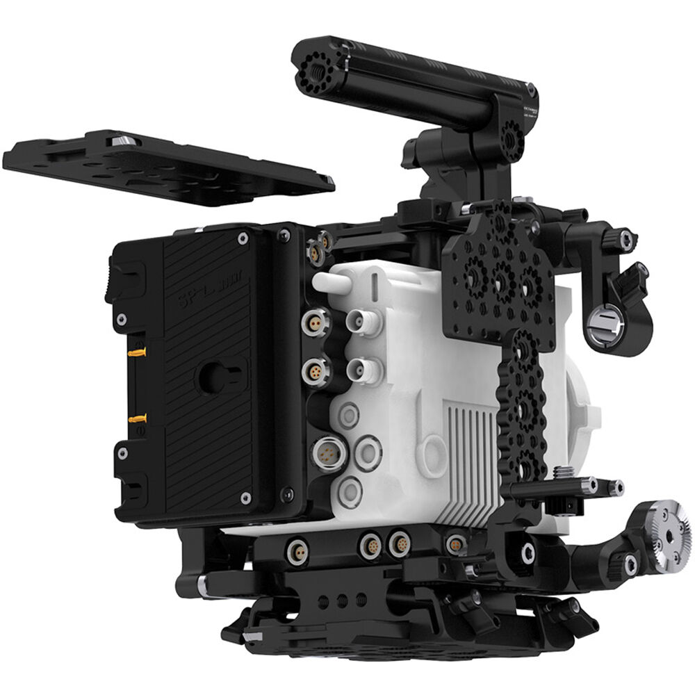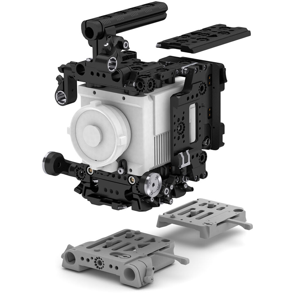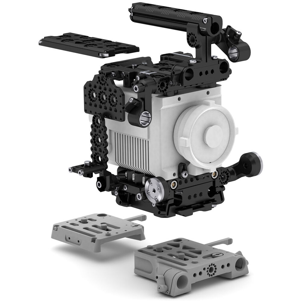 The Gold mount SWISS Cage Full Power Pro I/O Set for RED V-RAPTOR from OCTAMAS gear contains all recommended accessories for professional rigging, including power support. The SWISS cage universe follows industry norms, allowing advanced and complex setups and switching and sharing vital components between camera systems.