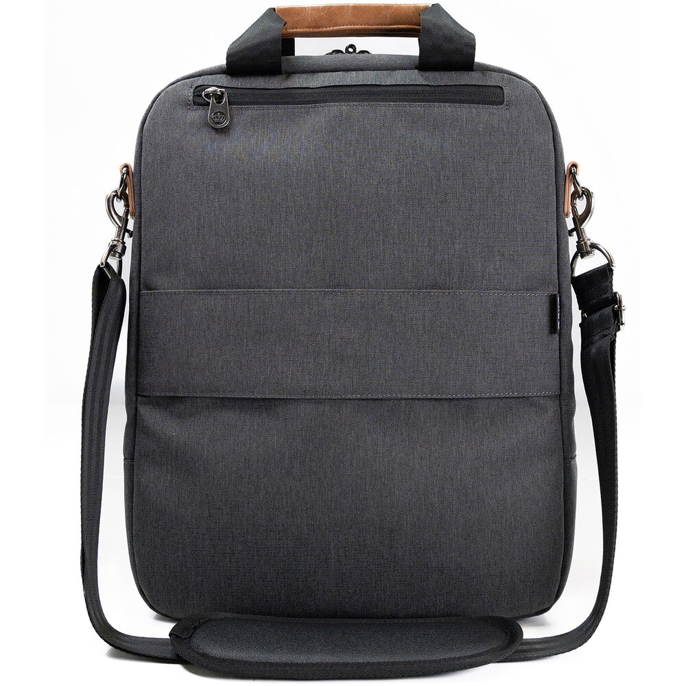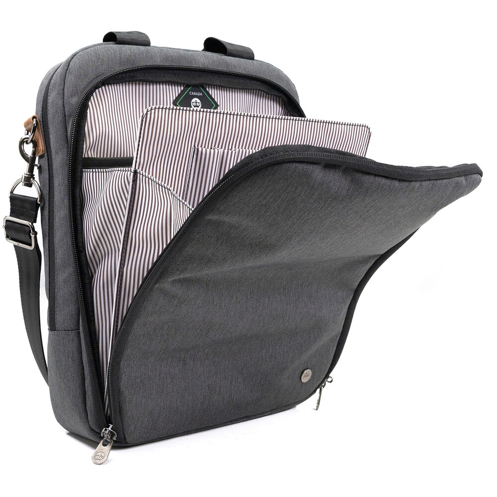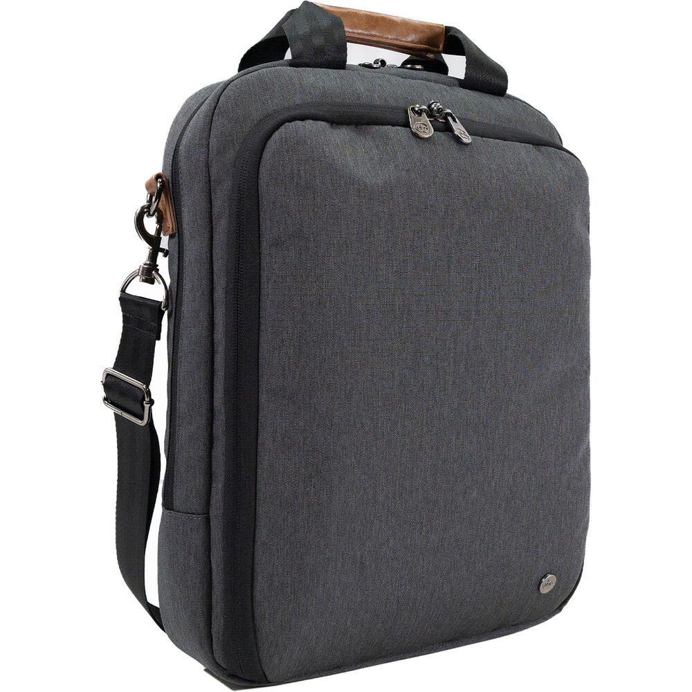 The gray and tan, 11L PKG International International Riverdale Recycled Messenger Bag is designed for the modern commuter. It features recycled, weatherproof materials and vegan leather accents with hidden magnets in the tote handles.
