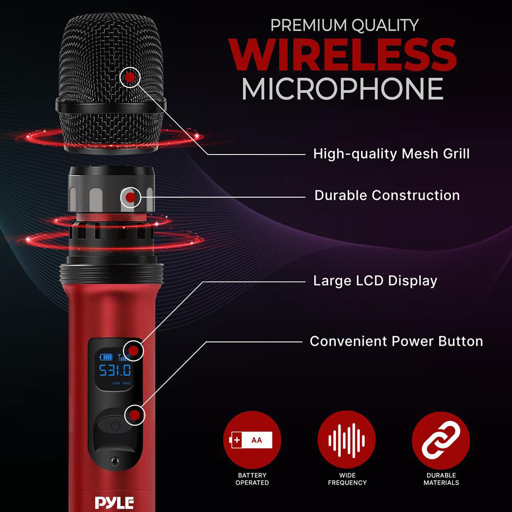 - Pyle Pro UHF 2-Channel Wireless Handheld Microphone System with Bluetooth (510 to 590 MHz, Red)