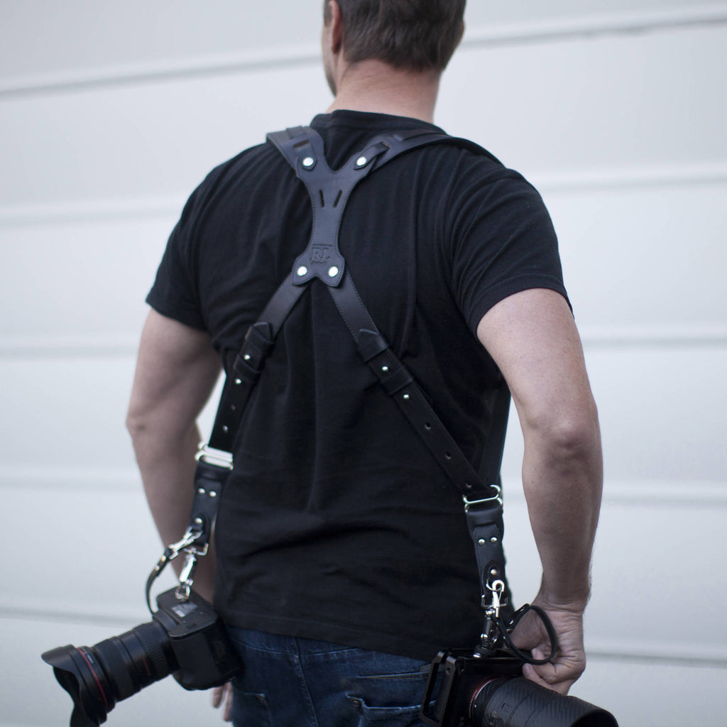 Carry two or three DSLR or mirrorless cameras with attached lenses in the beautifully handcrafted, made in the USA, small, jet black/black Clydesdale Pro-DLX Leather Camera Harness from RL Handcrafts . Photographers will appreciate the quick-access camera glide system, and the wide shoulder straps. Genuine leather combined with nickel-plated brass hardware ensure strength, looks, and durability. For comfort and stability, the harness has a six-point pivot system that allows for independent rotation points. The design permits personal configurations for different body types and movements. Two security straps are included.