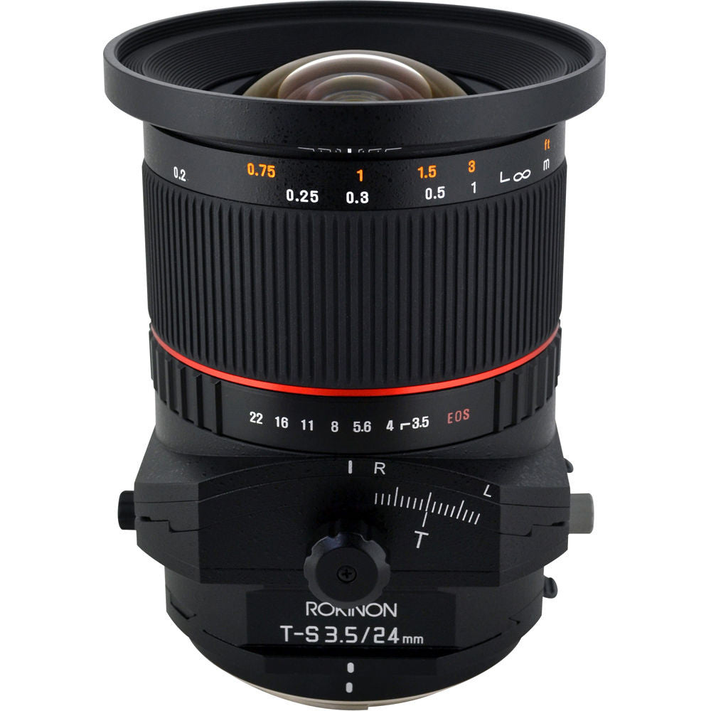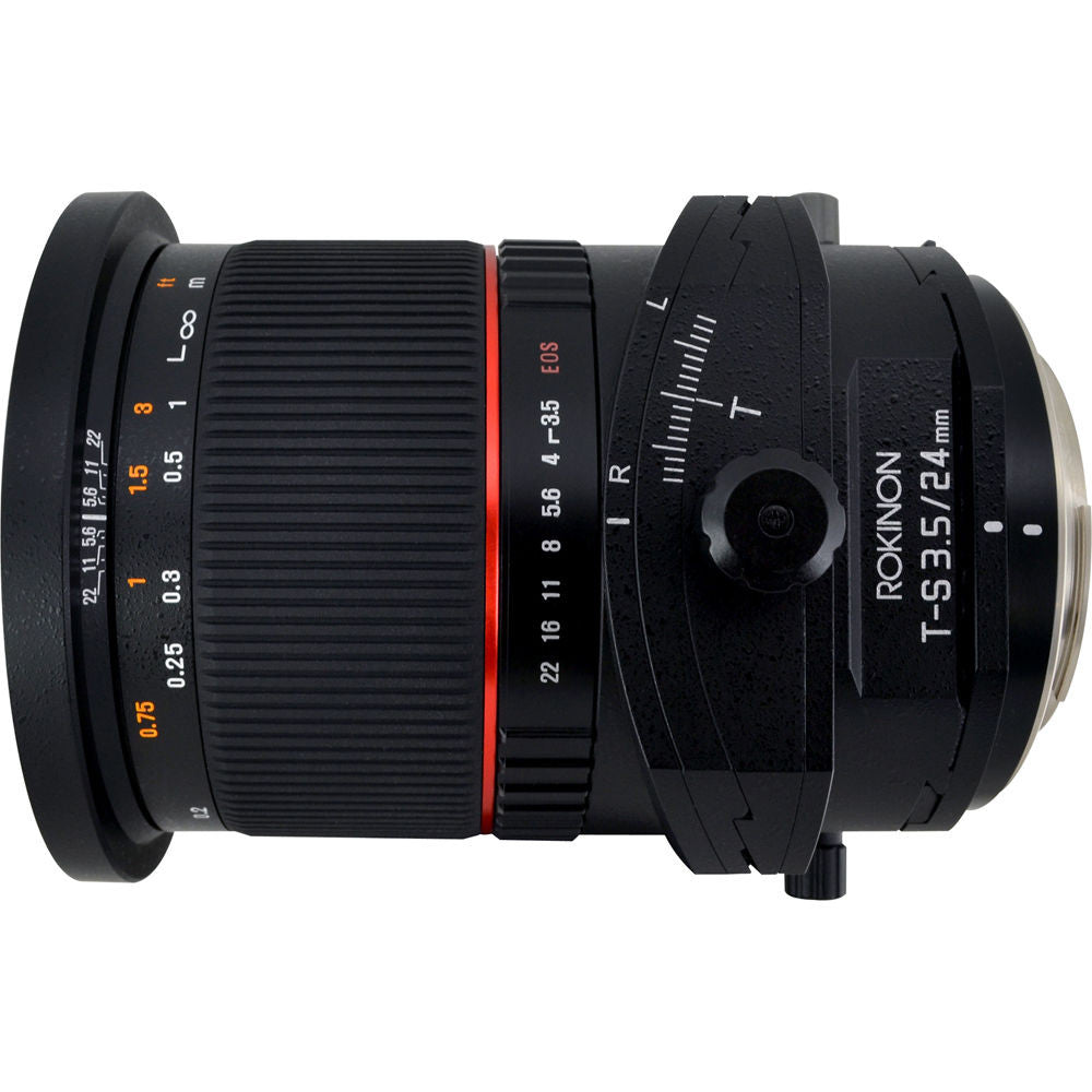 The Tilt-Shift 24mm f/3.5 ED AS UMC Lens for Canon from Rokinon is a wide-angle, full-frame lens fitted with the perspective control and tilt-shift functions. A tilt-shift lens allows the user to control perspective and correct convergence of lines within your frame, useful especially in architecture, landscape and product photography. The optical tilt mechanisms enable precise control of depth of field along with perspective control. It is compatible with both digital and film formats with an angle of view of 83.5º and on an APS-C size sensor has an angle of view of 56.9º and focal length equivalent of 38.4mm.