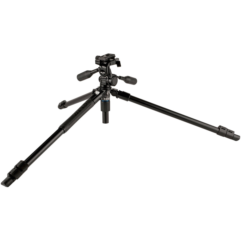 The Pro AL-323-3W Aluminum 3-Section Tripod with Arca-Type 3-Way Pan-Tilt Head from Slik is a versatile tripod with a load capacity of 8.8 pounds and a maximum height of 75.5" with the center column fully extended. The legs feature flip-lock joints for quick setup and the Rapid Flip Mechanism (R.F.M.) allows the legs angles to be spread for easy leveling on uneven surfaces, or for shooting from low angles. The center column is removeable and reversible for shooting with the camera inverted to almost ground level. The center column is made up of two segments, the short column section allows the legs to be spread for very low perspective shooting.