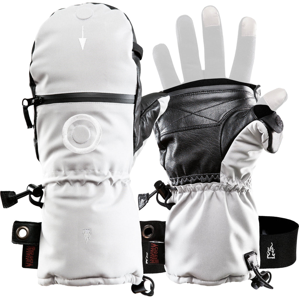 They are made from a windproof and highly water-resistant material with goatskin leather palms that are not only tough and wear resistant, but provide a secure and slip-resistant grip. Each mitten is lined with warm and comfortable Primaloft Gold insulation. When you need to use your fingers to operate a camera, access your phone, check your stats on a sport watch, or perform any one of a thousand tasks, simply fold back the finger and thumb flaps to expose your digits. A magnetic clasp keeps the flap out of your way, so it won't interfere with what you're doing. For added protection without sacrificing dexterity, layer the mittens over a pair of available liners.