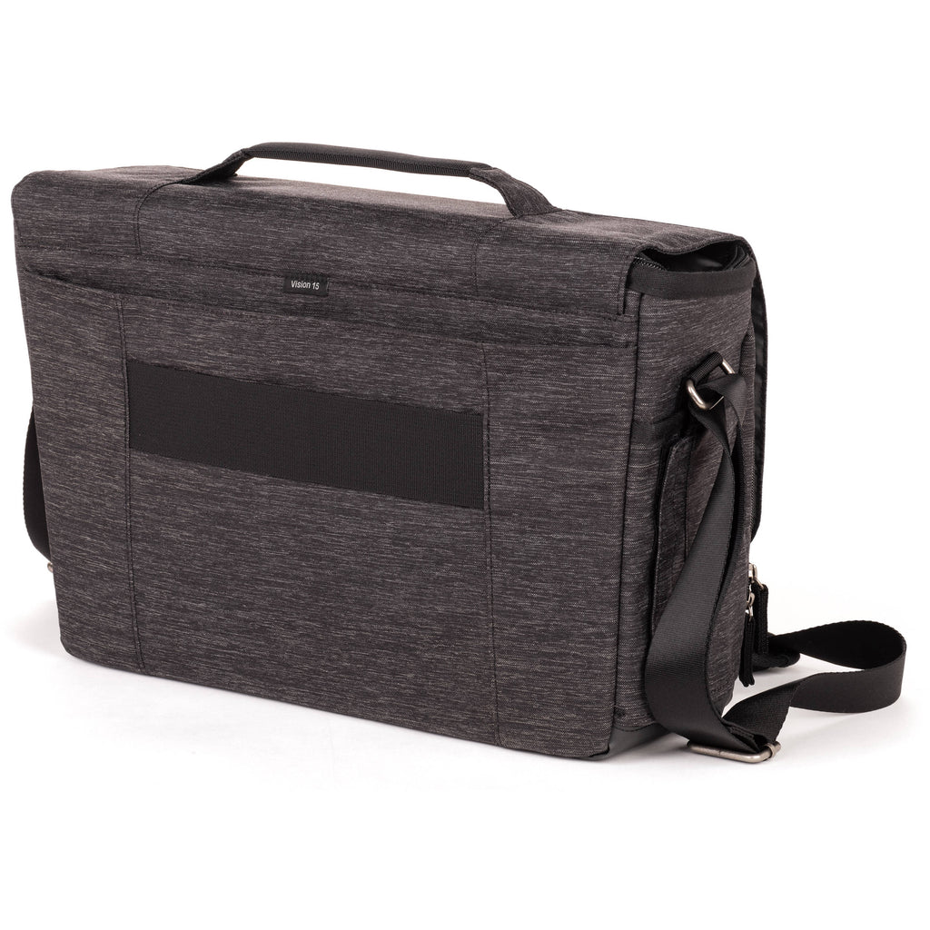 While its padded, adjustable shoulder strap allows this bag to be worn along or across the body, the Vision 15 can also be carried using its built-in top handle. Featuring durable nylon and polyester construction with a waterproof, abrasion-resistant bottom, this bag also includes a seam-sealed cover for use under heavy rain. While traveling with a rolling case that has a telescoping handle, a pass-through band across the rear panel allows the entire bag to be mounted onto such handles for added convenience.